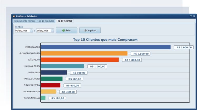 O gráfico Top 10 Clientes te ajuda a priorizar contatos importantes para fortalecer relacionamentos com os principais clientes.
