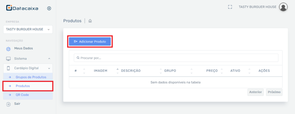 2- Em Navegação clique em Cardápio Digital, clique em Produtos e clique em Adicionar Produto.