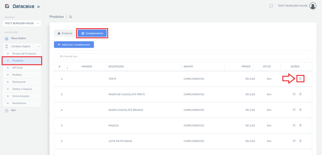 2- Em Cardápio Digital, clique em Produtos e em Complementos, clique sobre a Lixeira relacionada ao complemento que deseja excluir.