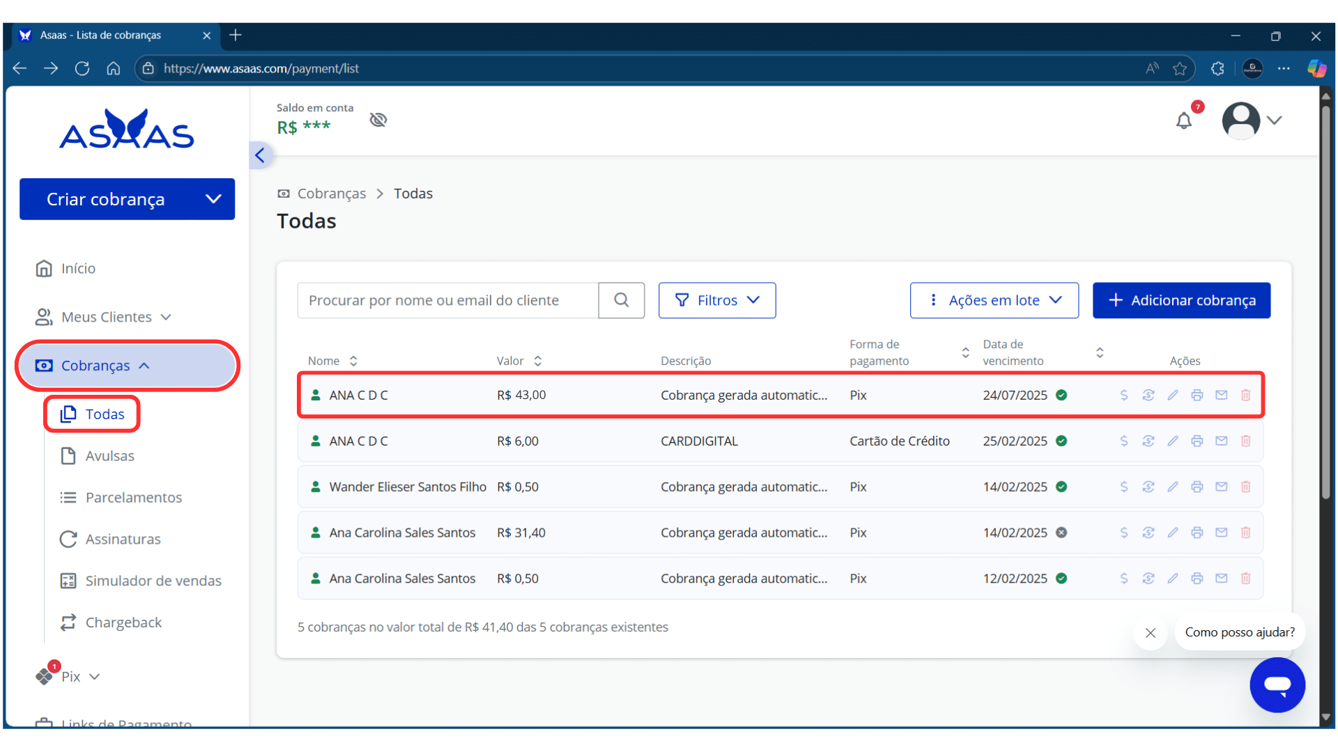 No Menu lateral, clique em Cobranças > Todas. Em seguida, clique no registro encontrado.