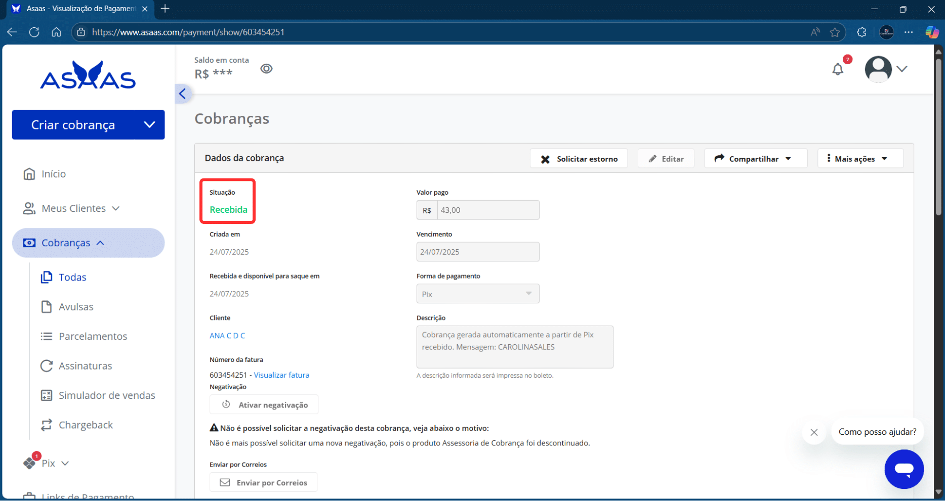 Detalhes da transação no Asaas