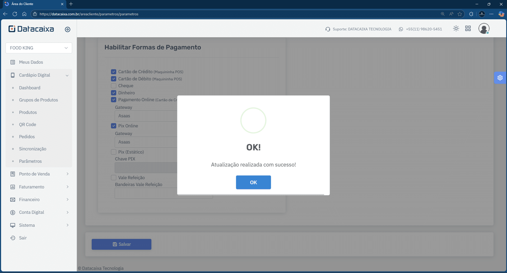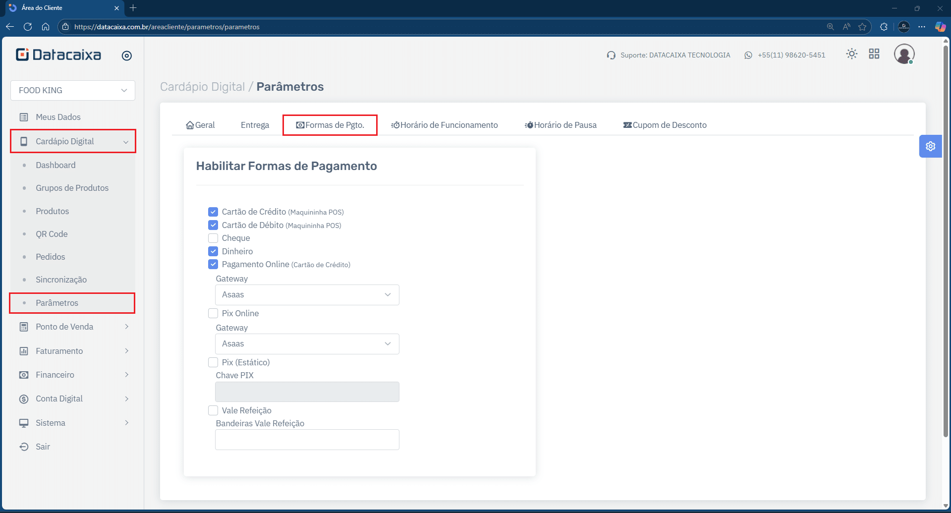 11- Clique em Cardápio Digital > Parâmetros > Formas de Pagamento.