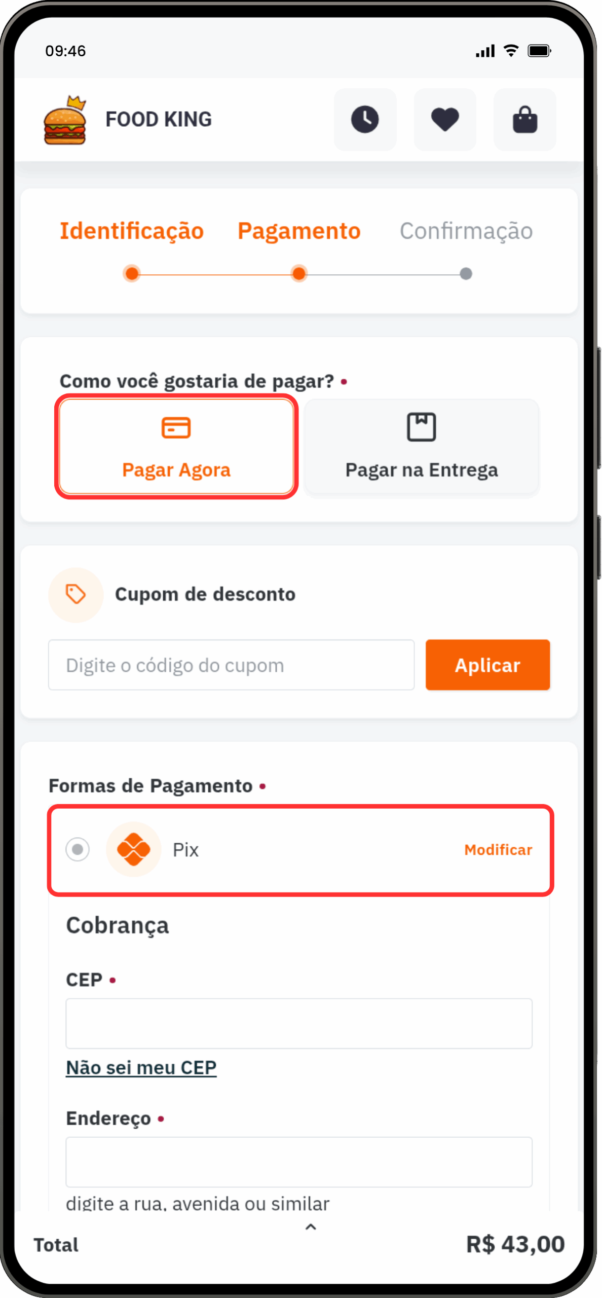 Veja agora na prática como o pedido no Cardápio Digital é realizado, com a forma de pagamento Pix selecionada.