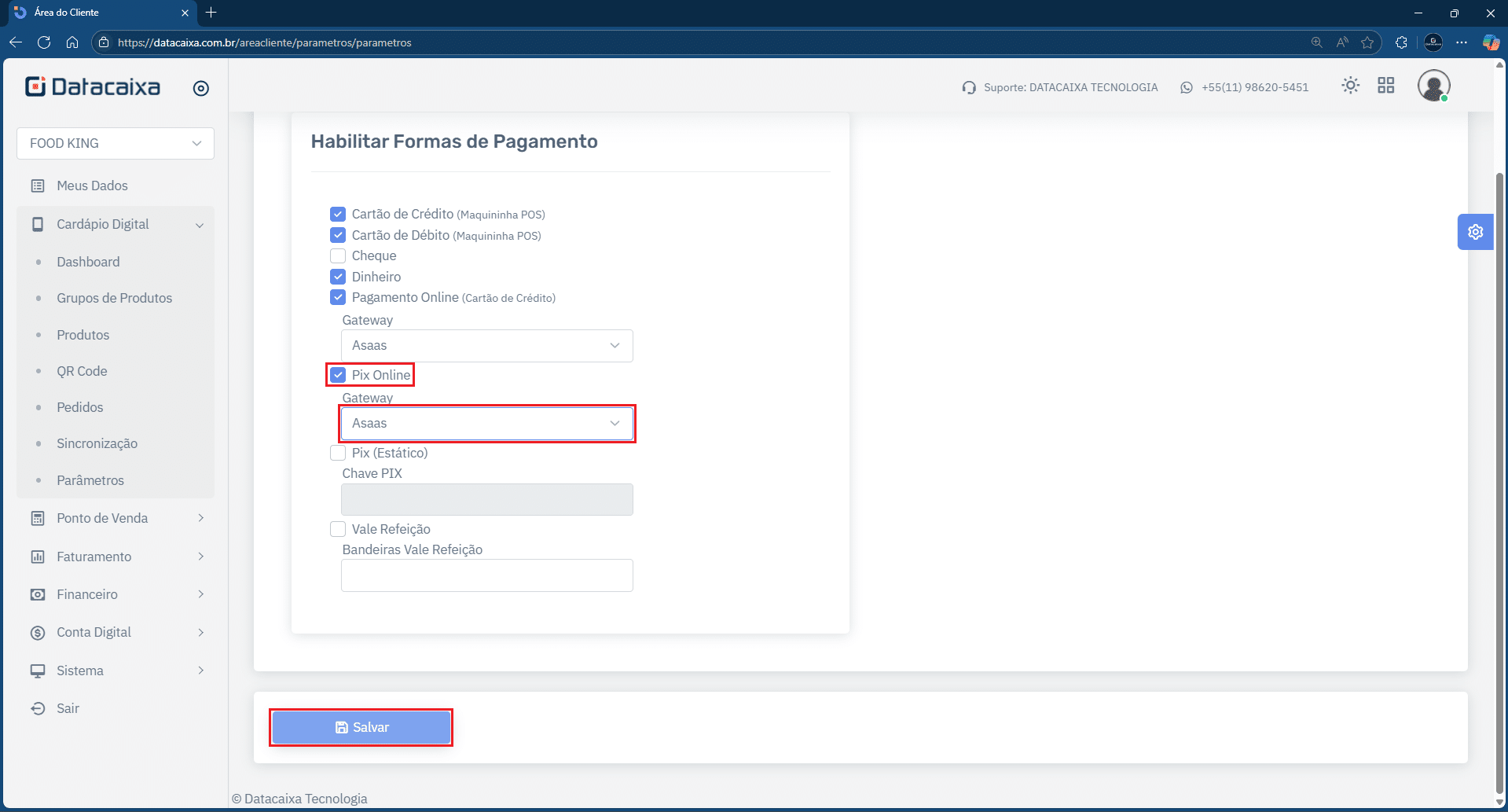 12- Marque a opção Pix Online e selecione o Gateway do Asaas. Em seguida, clique em Salvar.