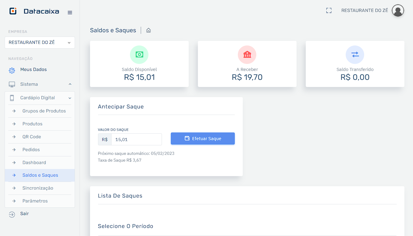 Em Saldos e Saques você poderá verificar o valor para retirada em Saldo Disponível e poderá Antecipar o Saque, caso necessário.