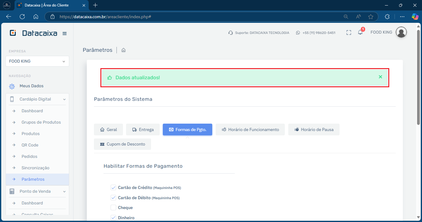 Tudo pronto! O Pagamento Online foi habilitado no seu Cardápio Digital com sucesso.