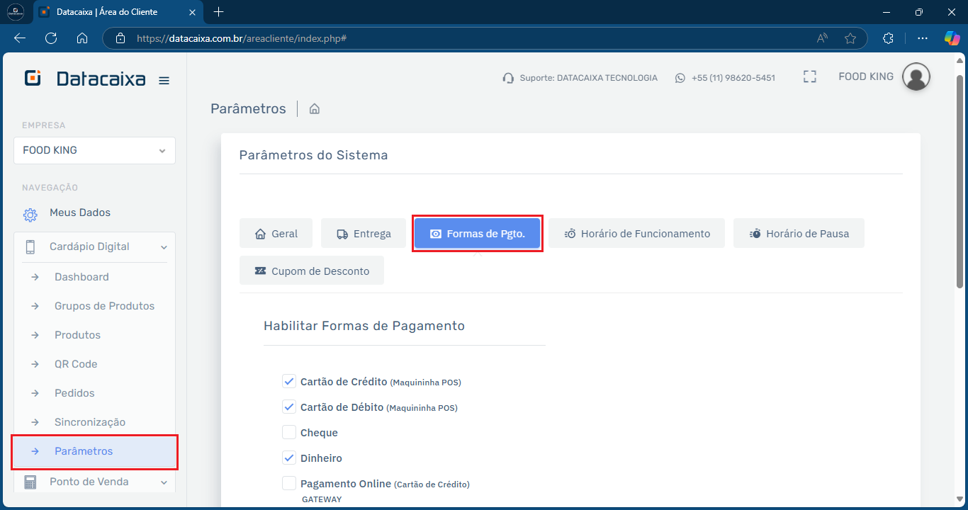 2- Em Navegação clique em Cardápio Digital > Parâmetros > Formas de Pagamento.