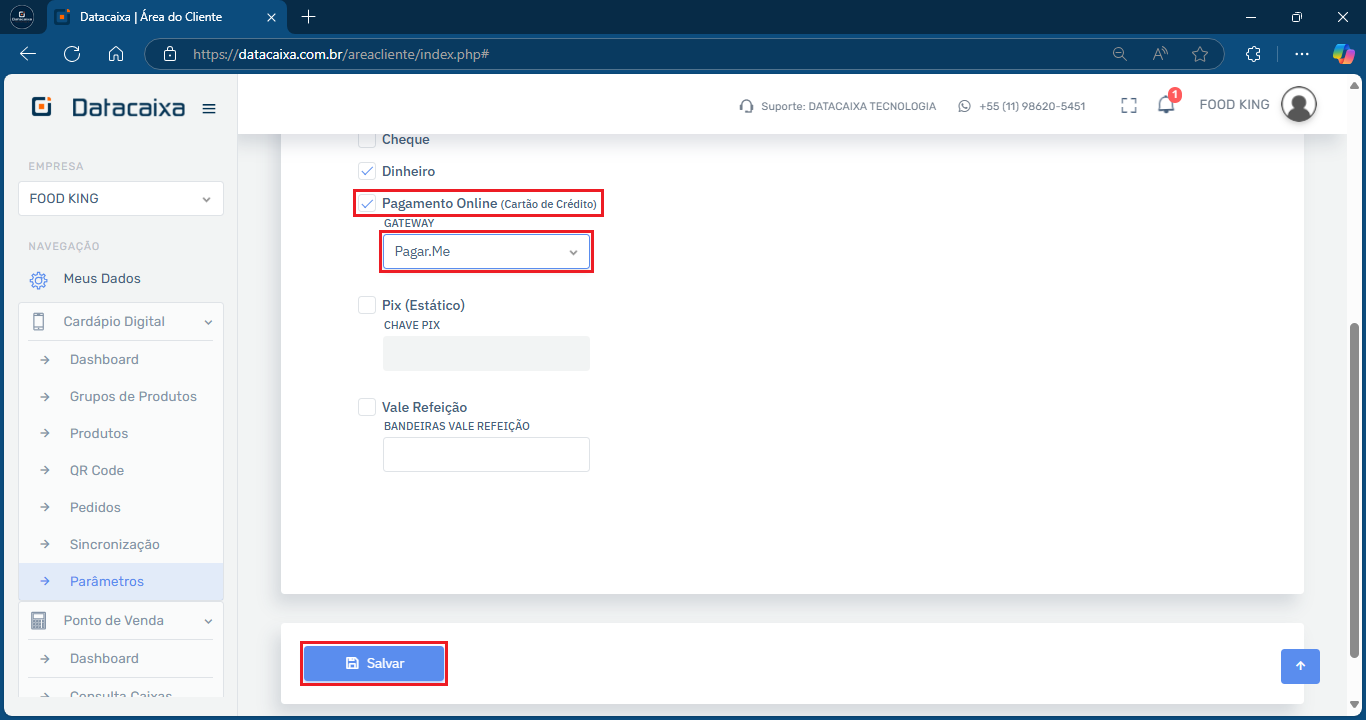 3- Selecione a opção Pagamento Online (cartão de crédito) > Pagar.me. Em seguida, clique em Salvar.
