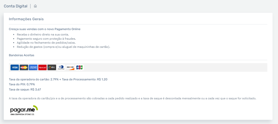 - Taxa de processamento: R$ 1,20 por transação.