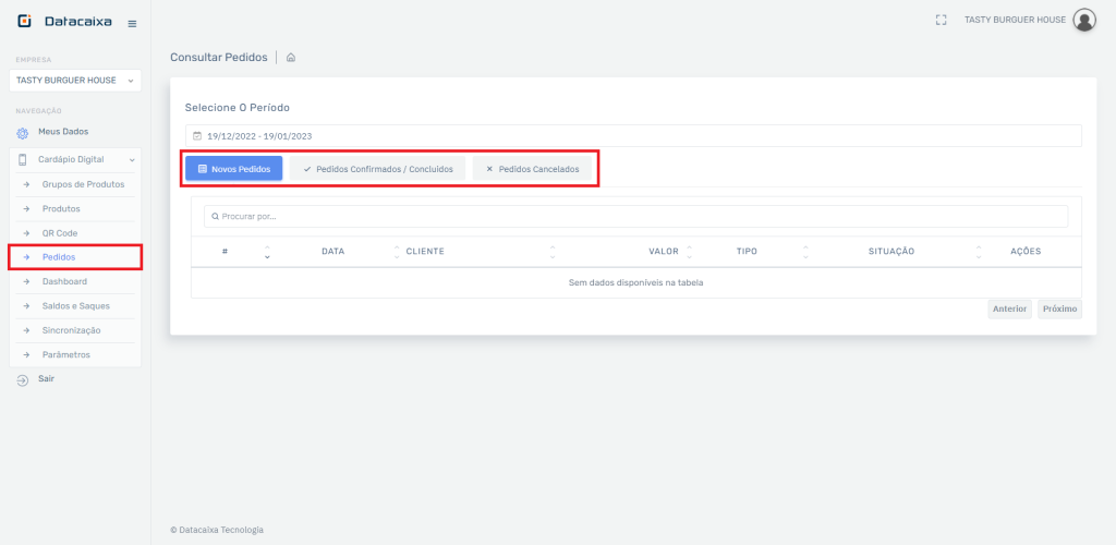 2- Em Navegação clique em Cardápio Digital, clique em Pedidos e clique em Novos Pedidos.