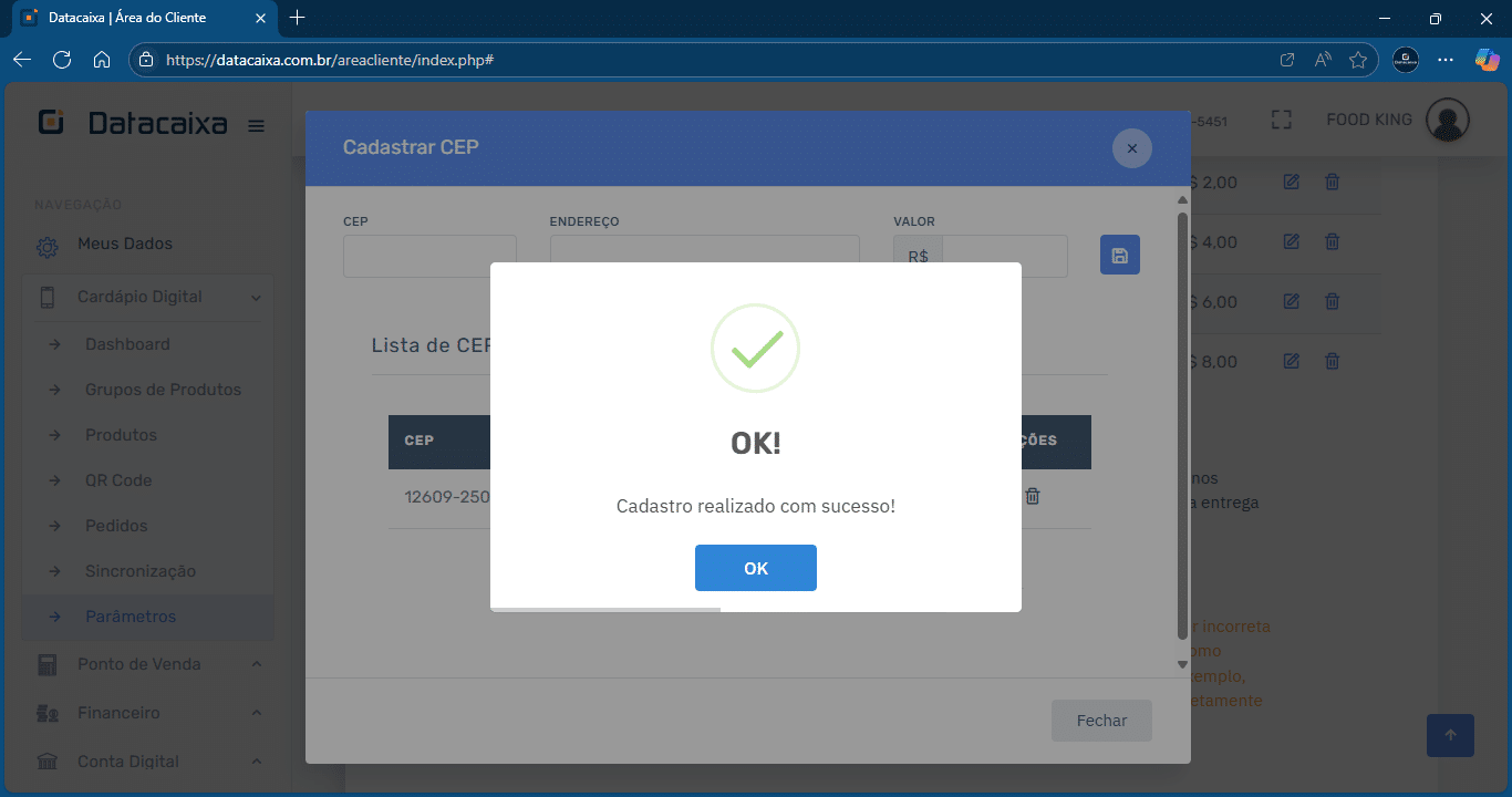 Pronto! Você cadastrou um CEP de Exceção no Cardápio Digital.
