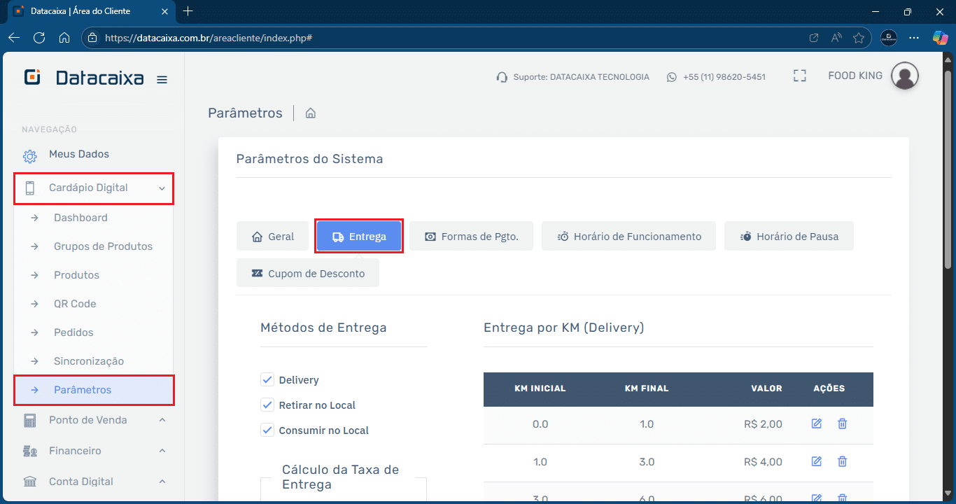 2- Acesse Cardápio Digital > Parâmetros. Em seguida, clique na aba Entrega.