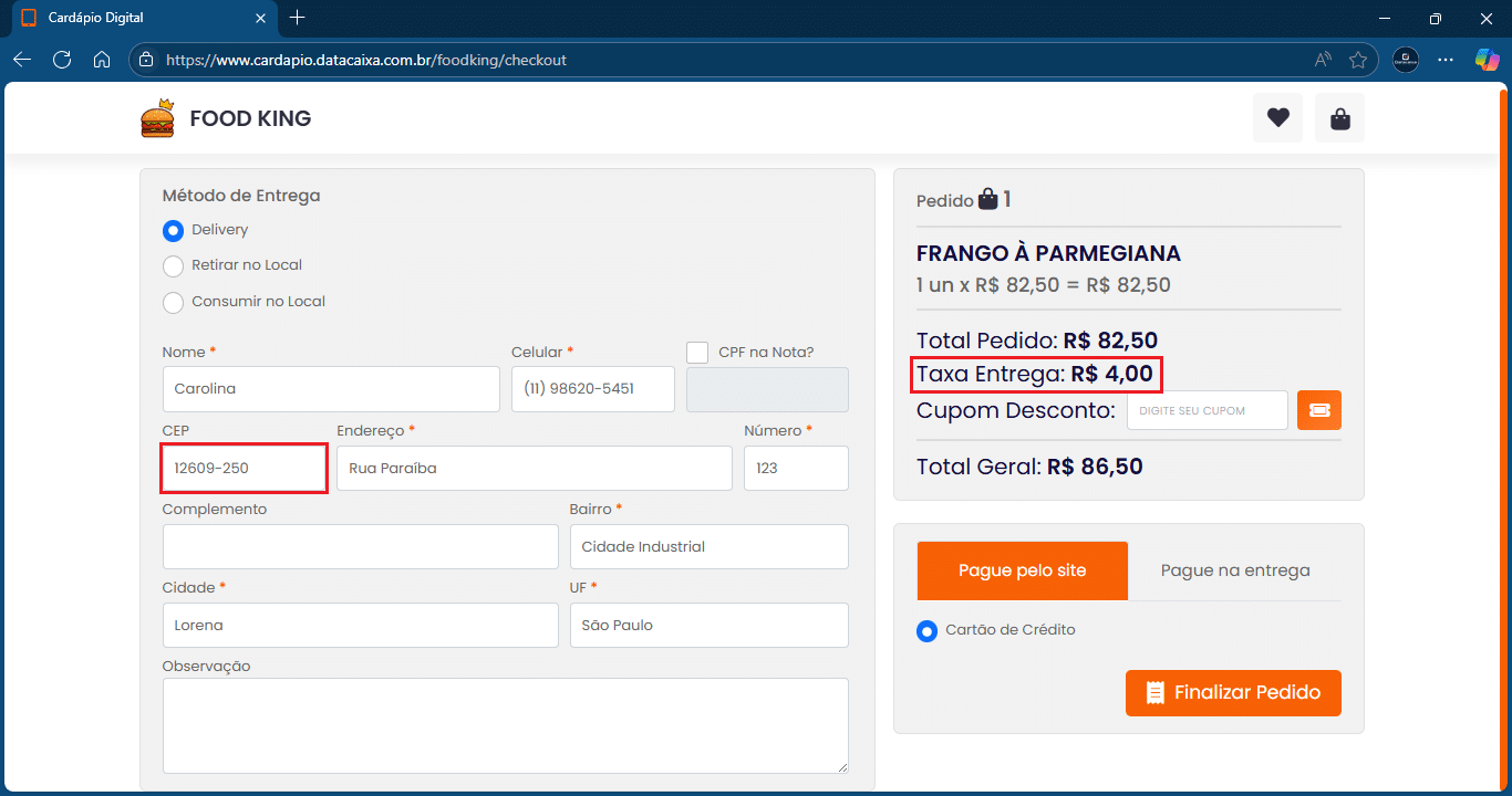 Agora, ao finalizar um pedido com um CEP de Exceção, o sistema aplica automaticamente a taxa de entrega com o valor fixo configurado.