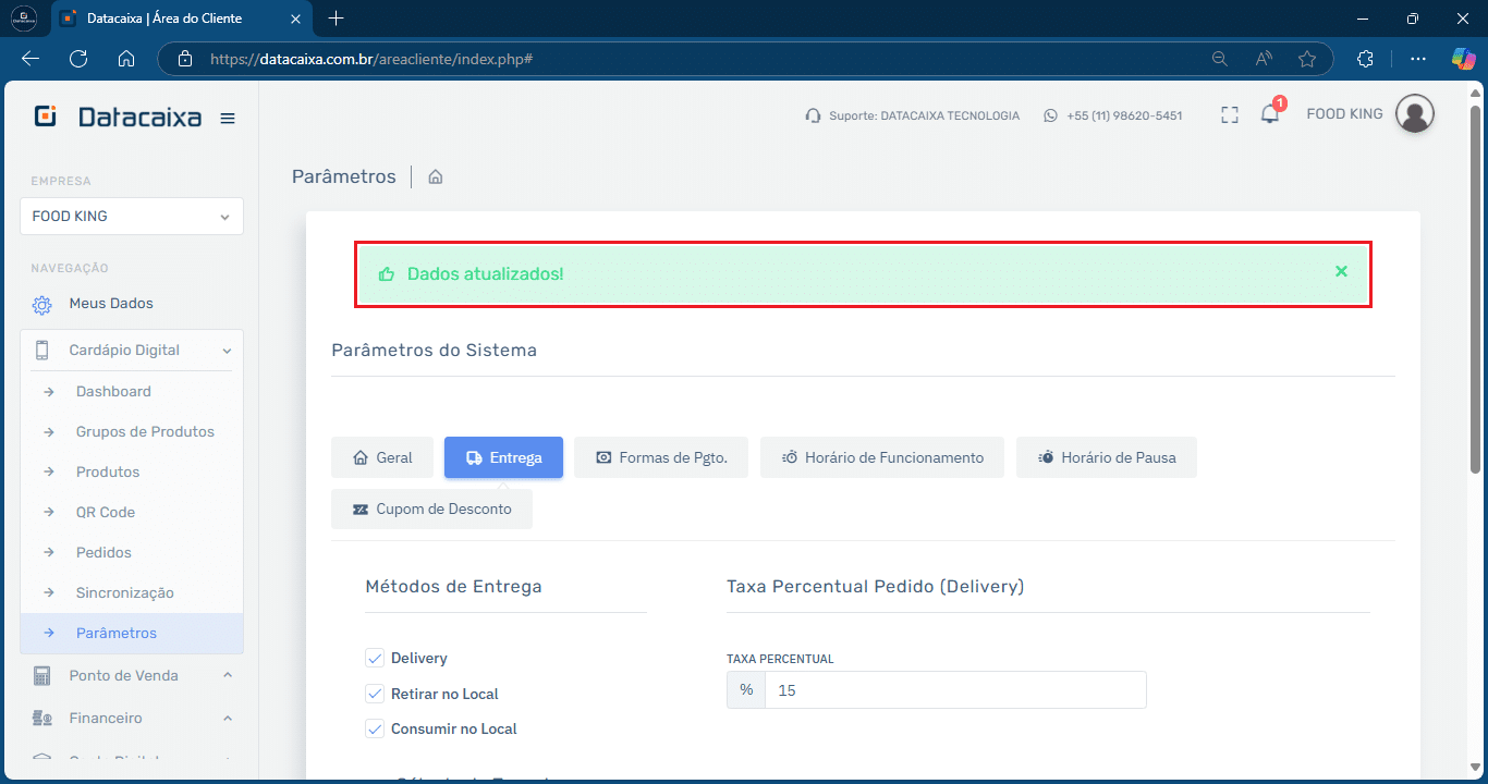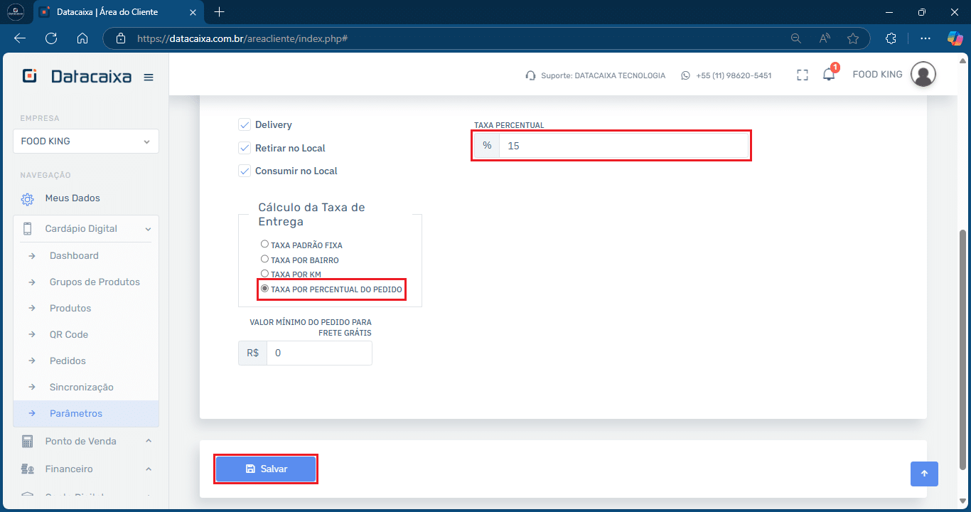 Pronto! Agora a taxa de entrega será calculada automaticamente pelo percentual definido.