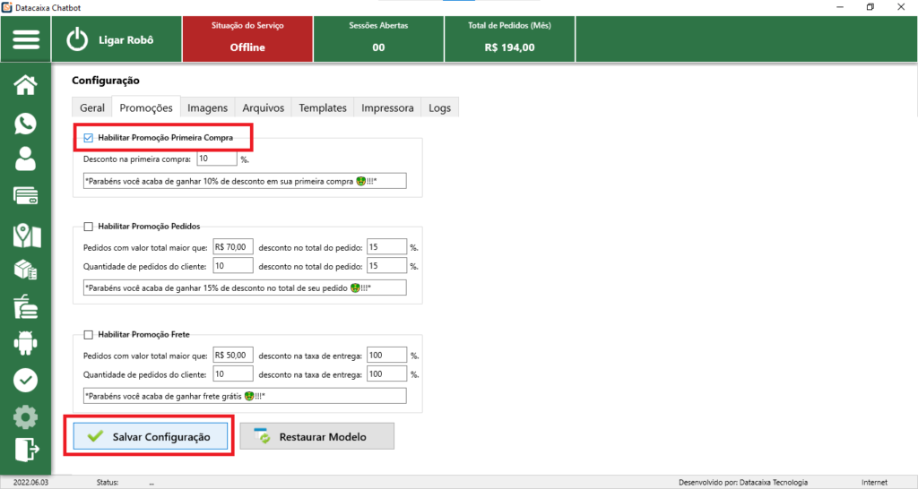 Pronto! Você habilitou a promoção de primeira compra no Sistema.