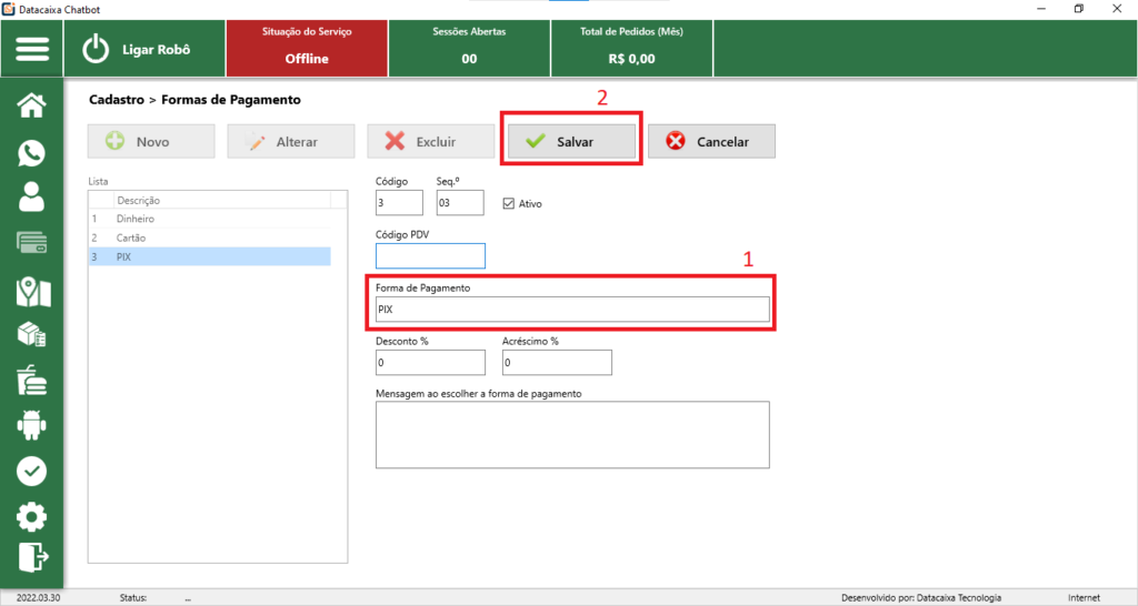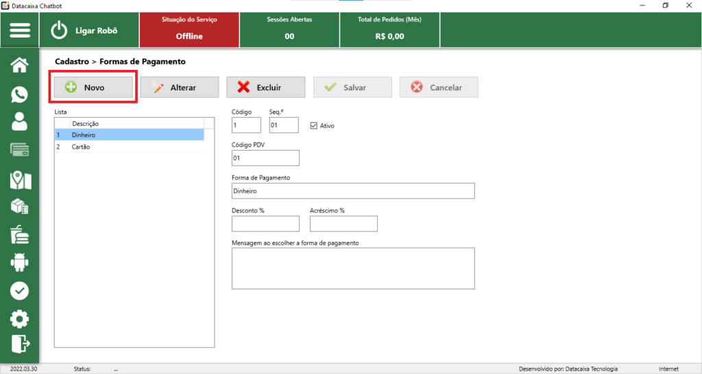 Pronto! Você criou uma nova forma de pagamento no sistema.