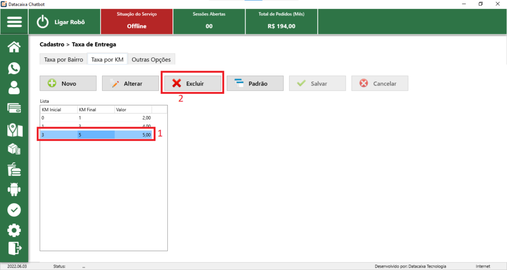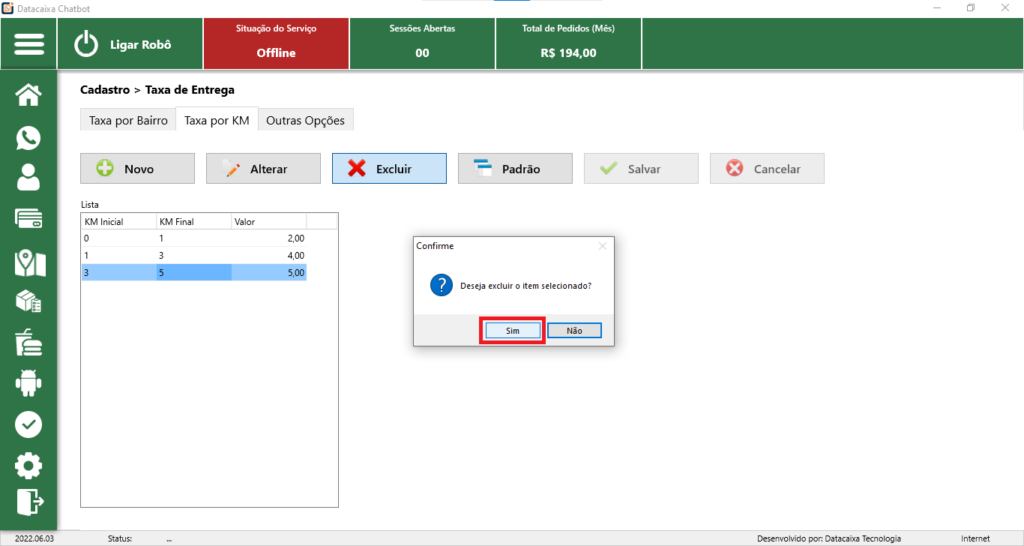 Pronto! Você excluiu uma Taxa por KM no Sistema.