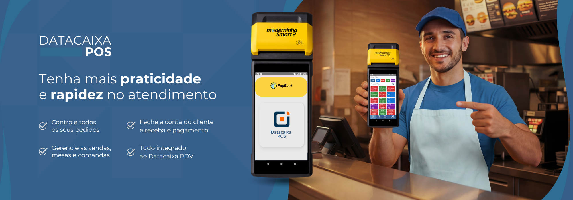 O Datacaixa POS funciona exclusivamente na Moderninha Smart 2 (PagBank) com total compatibilidade. No entanto, o desempenho do aplicativo pode variar conforme o fabricante do equipamento: