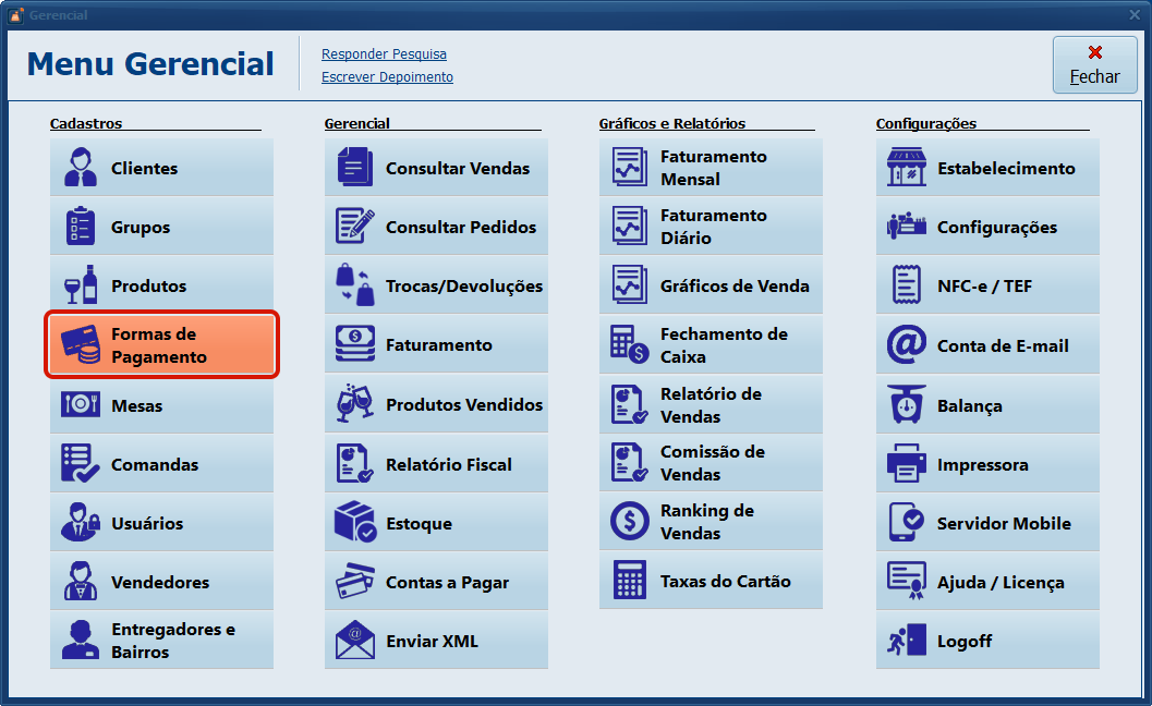 1- Acesse Menu Gerencial > Formas de Pagamento.