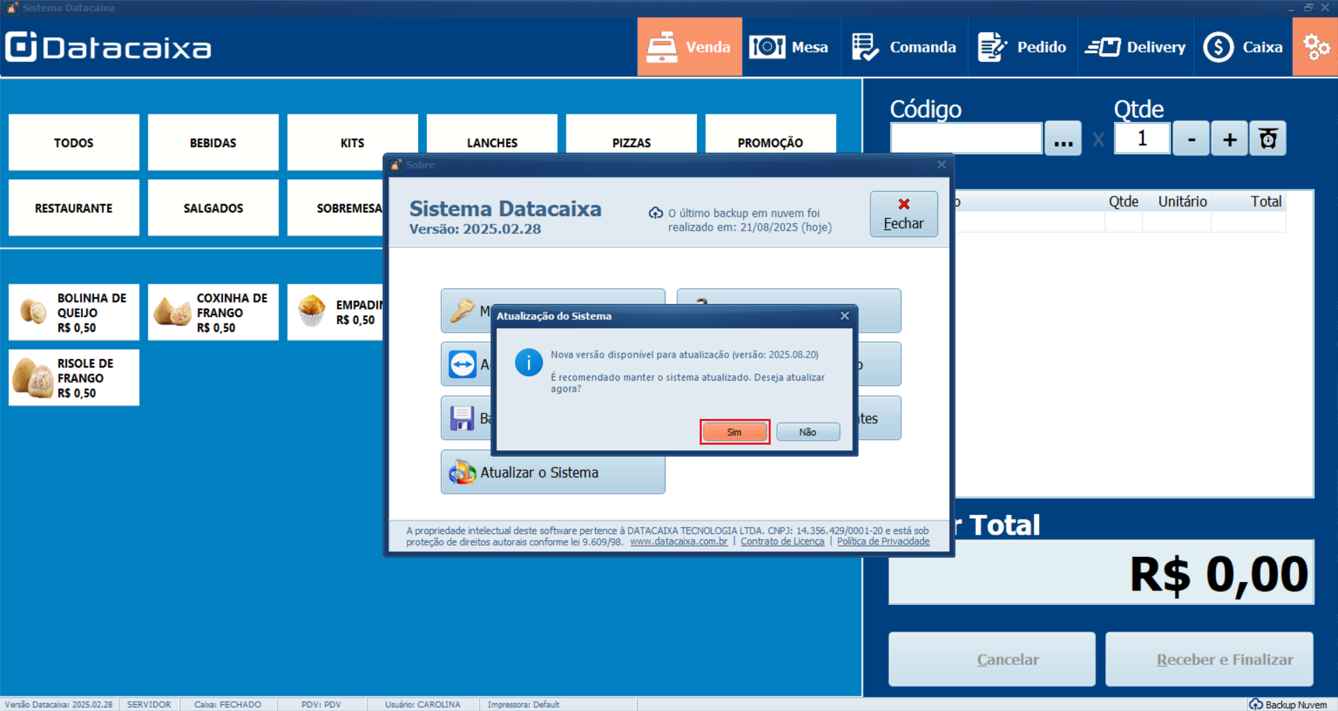 A atualização do Sistema Datacaixa PDV mantém todos os recursos e correções em dia, garantindo operação estável e confiável. Nesse processo, o Sistema Datacaixa Gestão também é atualizado automaticamente.