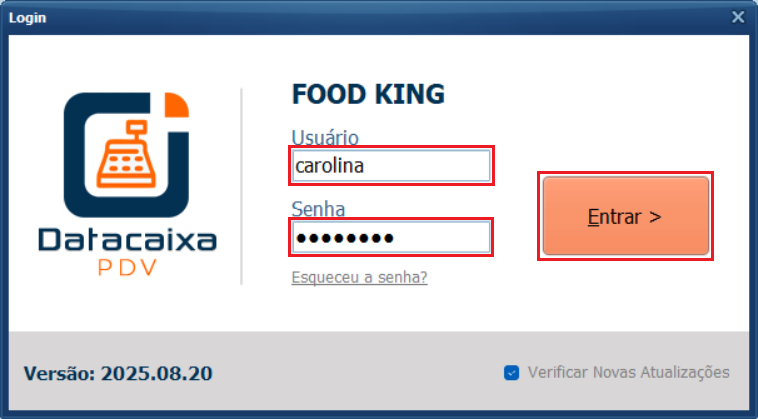 6- Abra o Sistema Datacaixa PDV, informe o Usuário e Senha > Entrar.