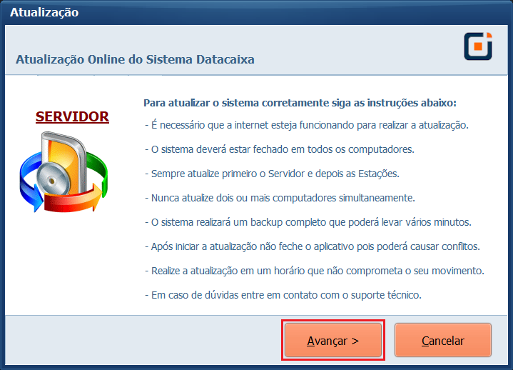 • Sempre inicie a atualização pelo Servidor e, em seguida, atualize cada estação, garantindo que todas fiquem na mesma versão.