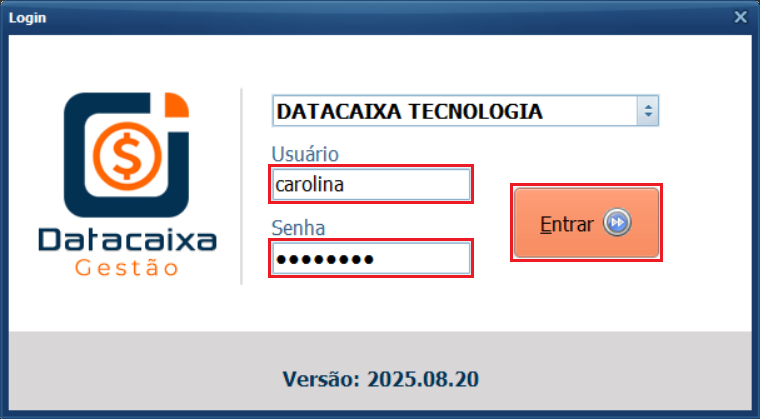 6- Abra o Sistema Datacaixa Gestão, informe o Usuário e Senha > Entrar.