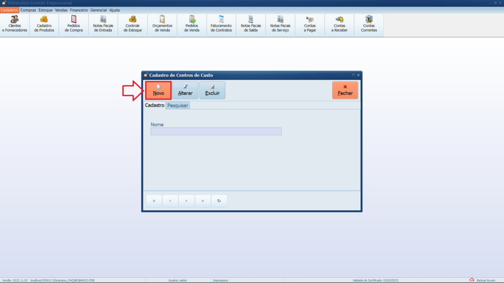 4- Preencha o nome do Centro de Custo e clique em Salvar.