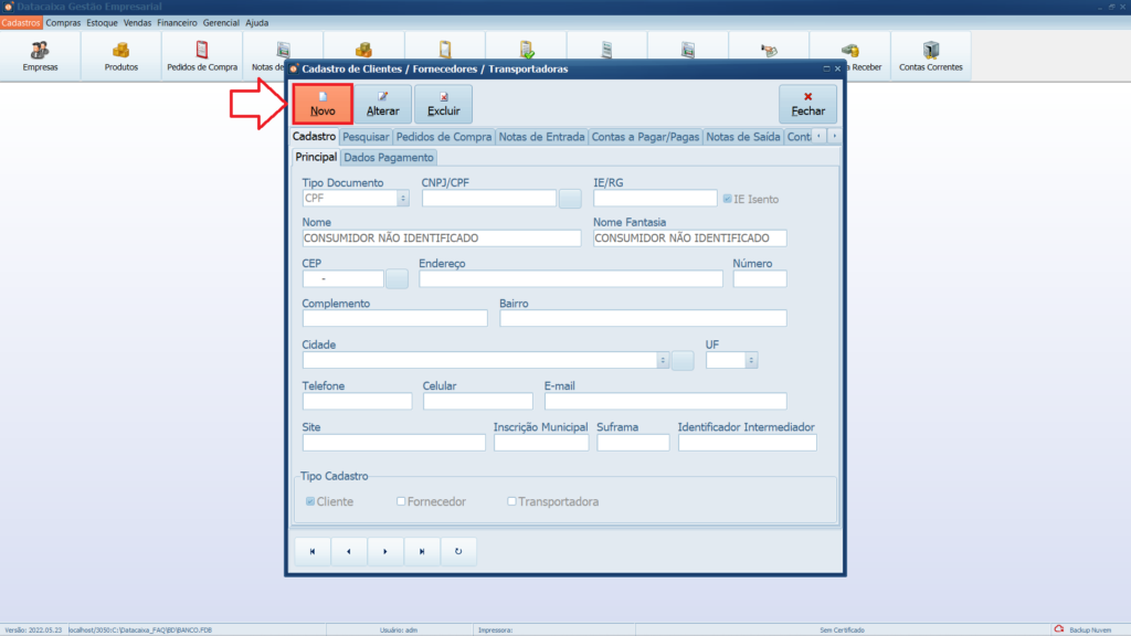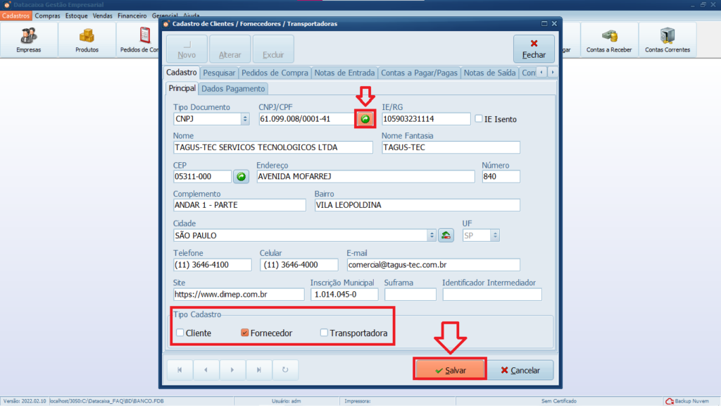 4- Preencha os dados do Cliente/Fornecedor/Transportadora e clique em Salvar.