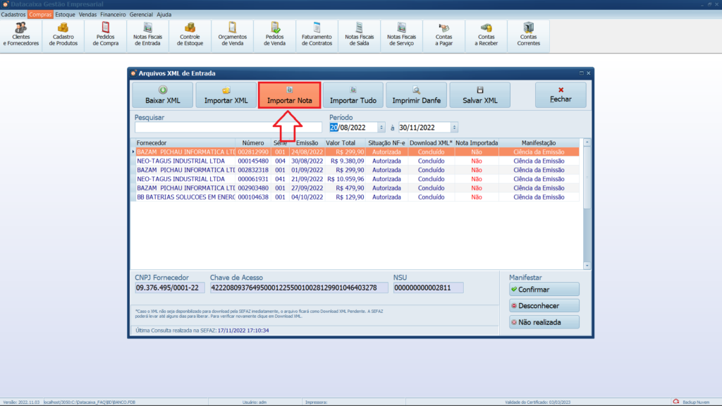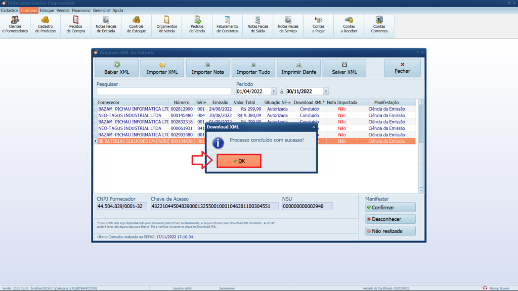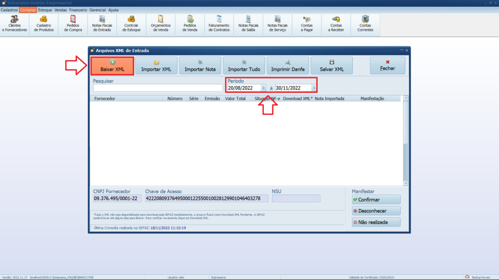 3- Clique em Baixar XML e ajuste o período para os XML que deseja verificar.