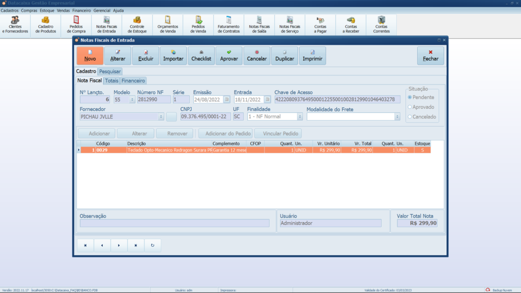 Pronto! A nota de entrada foi registrada e está pendente de aprovação.