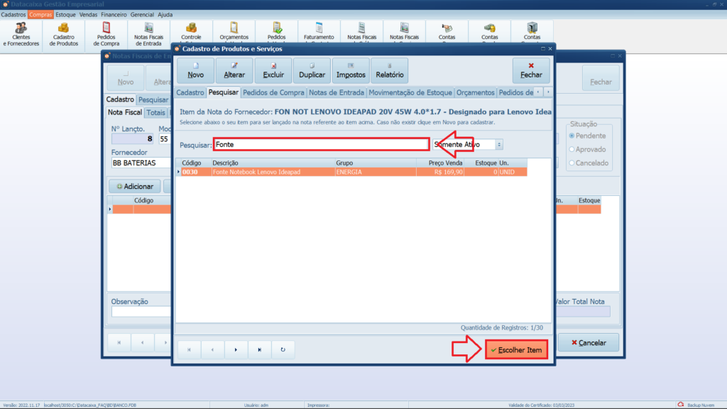 8- No segundo caso, o produto da nota possivelmente terá um nome diferente do seu cadastrado no Sistema, será necessário vincular este produto ao seu para conseguir dar entrada. Pesquise a descrição conforme está cadastrado no Sistema, selecione o produto e clique em Escolher Item.