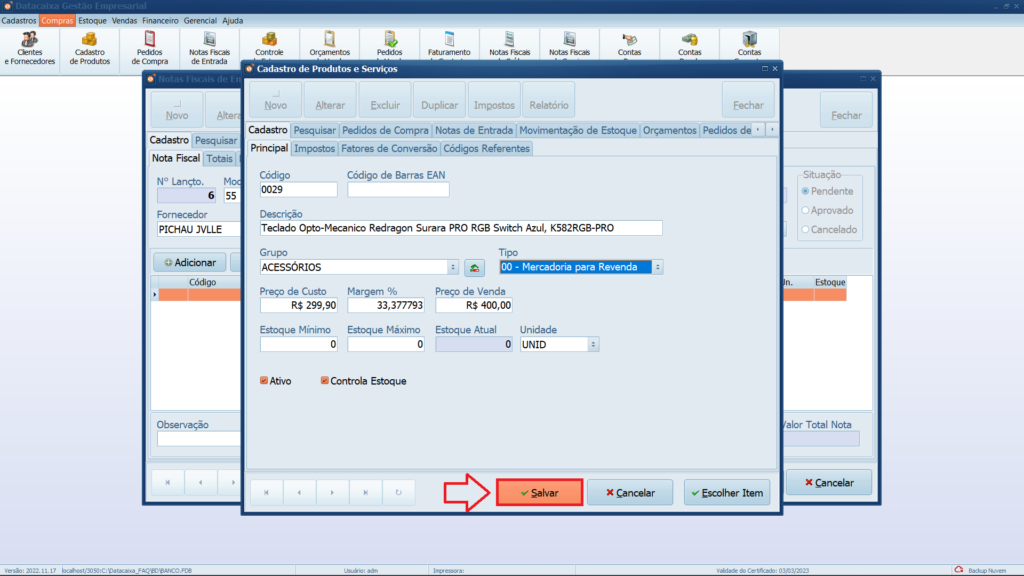 6- É possível que ao importar não tenha os produtos cadastrados ainda no sistema, nesse caso clique em Novo e o sistema irá criar um cadastro com base nos dados referente ao item na nota importada.