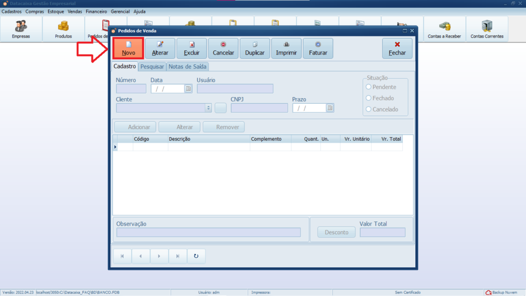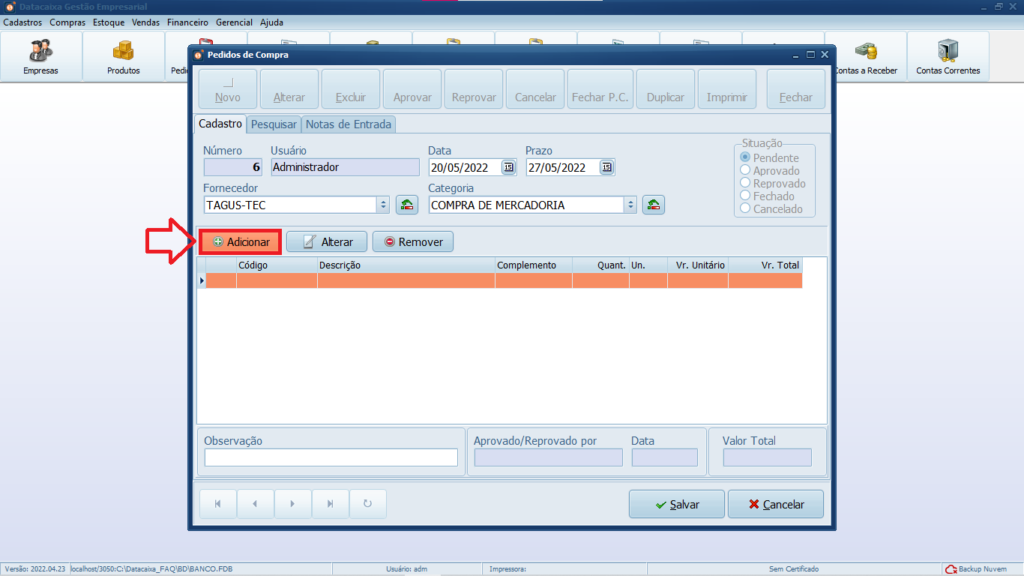 3- Preencha os dados do Pedido e Clique em Adicionar.