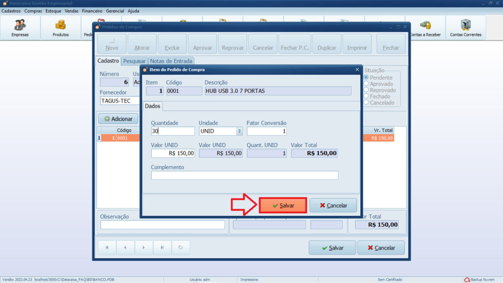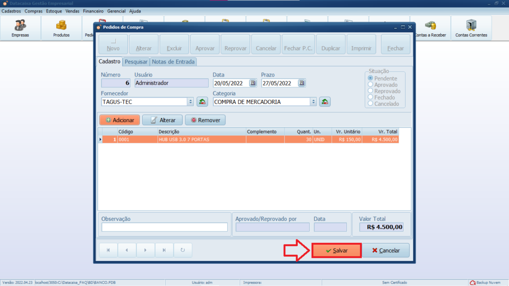5- Preencha os dados do Produto selecionado e clique em Salvar.