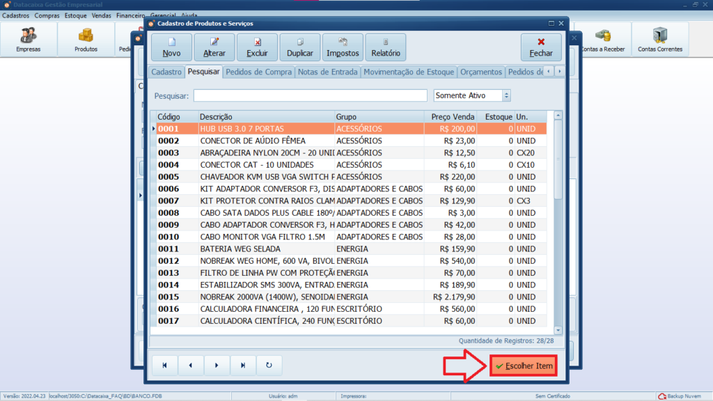 4- Selecione o Produto que deseja incluir no Pedido e clique em Escolher Item.