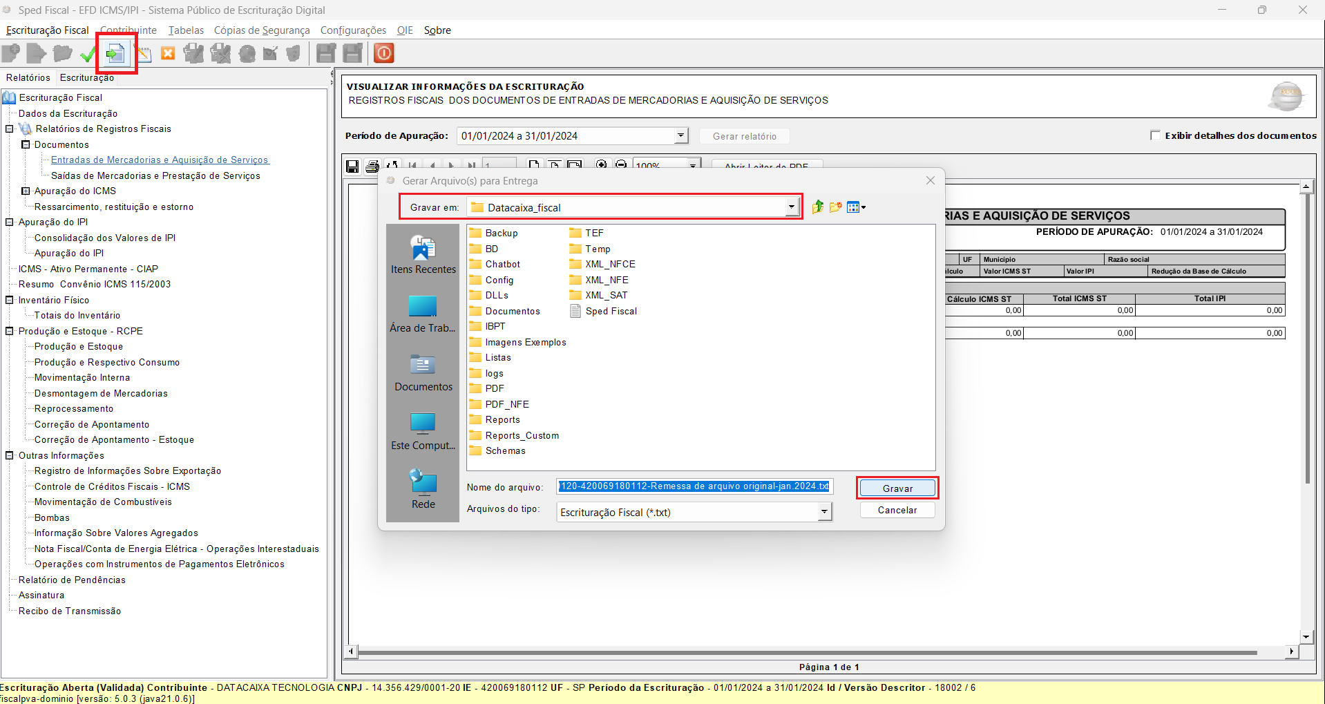 28- Clique no botão de seta verde para Gerar Arquivo de Escrituração para Entrega, selecione a pasta onde deseja salvar o arquivo validado > Gravar.