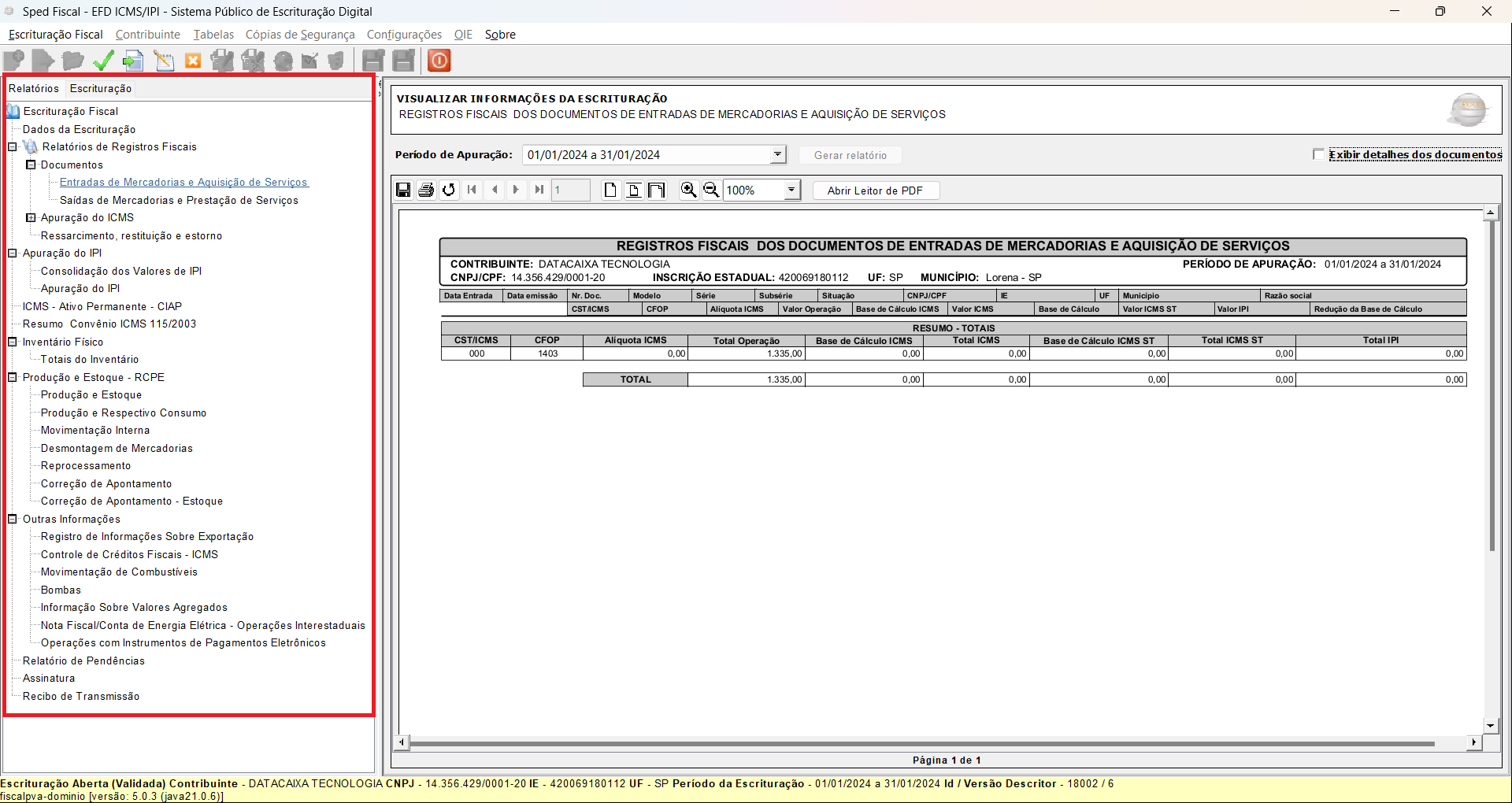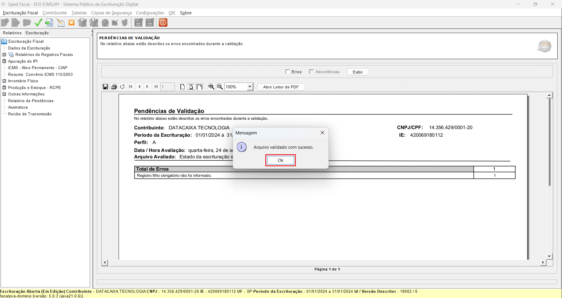 Pronto! O arquivo foi validado com sucesso com todos os relatórios disponíveis da Escrituração Fiscal.