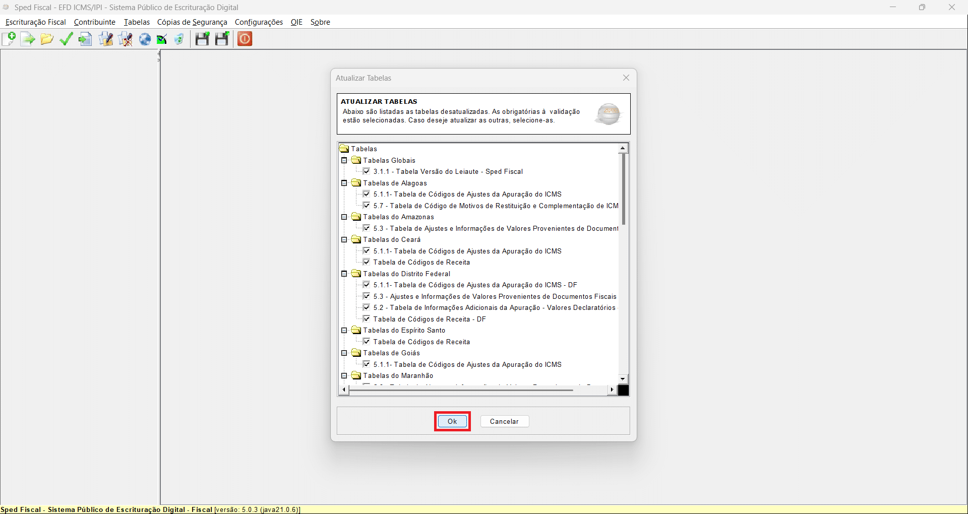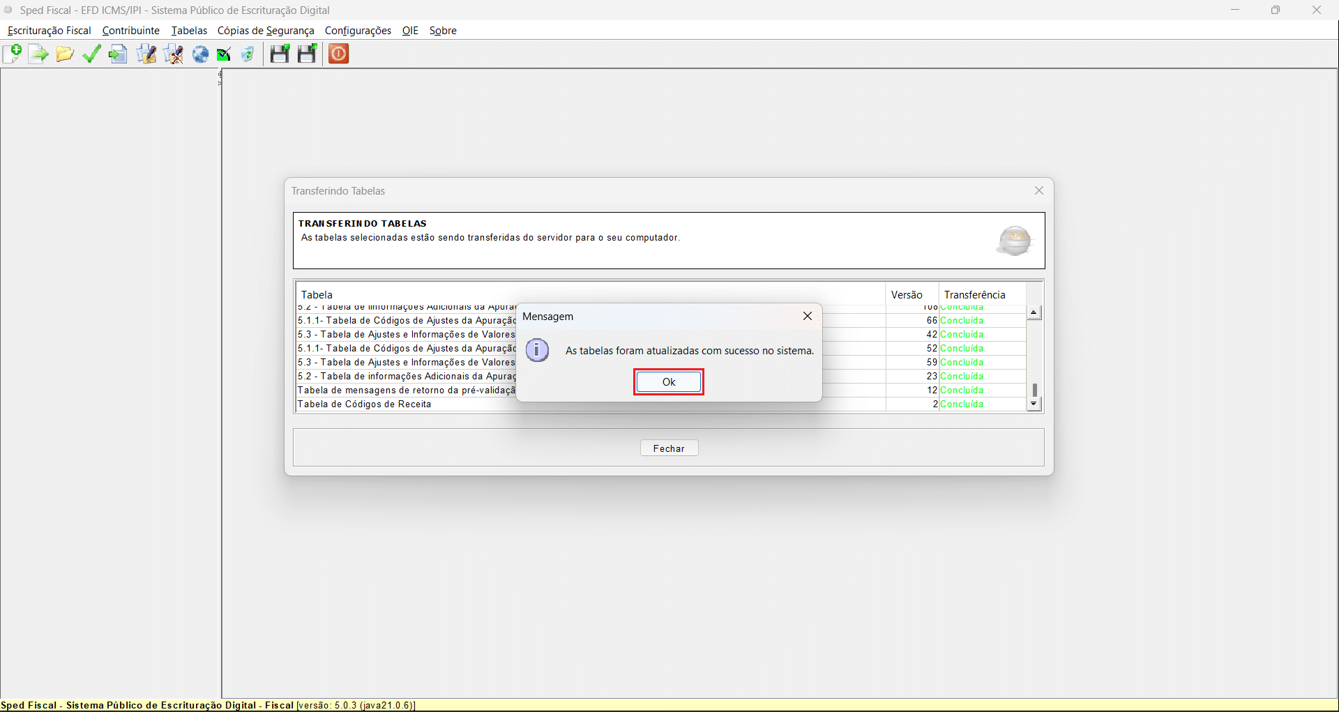 20- As tabelas foram atualizadas com sucesso no sistema. Clique em OK para prosseguir.