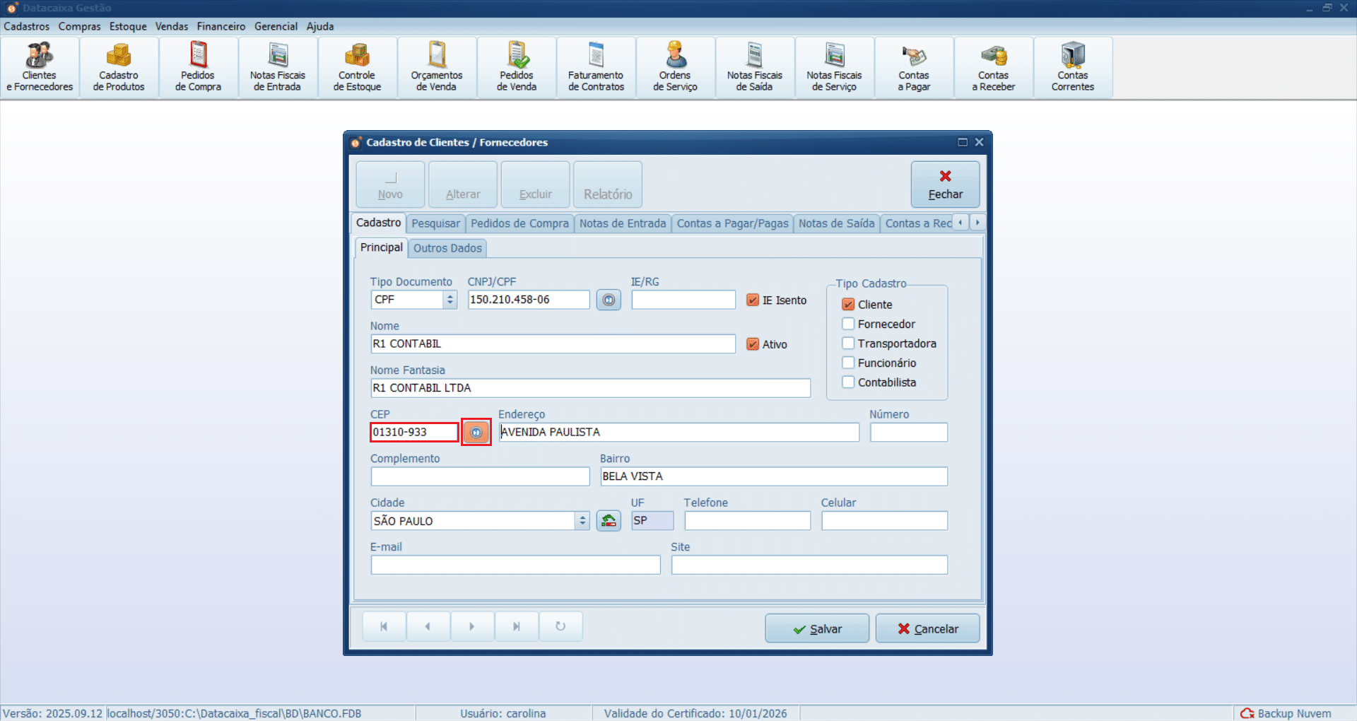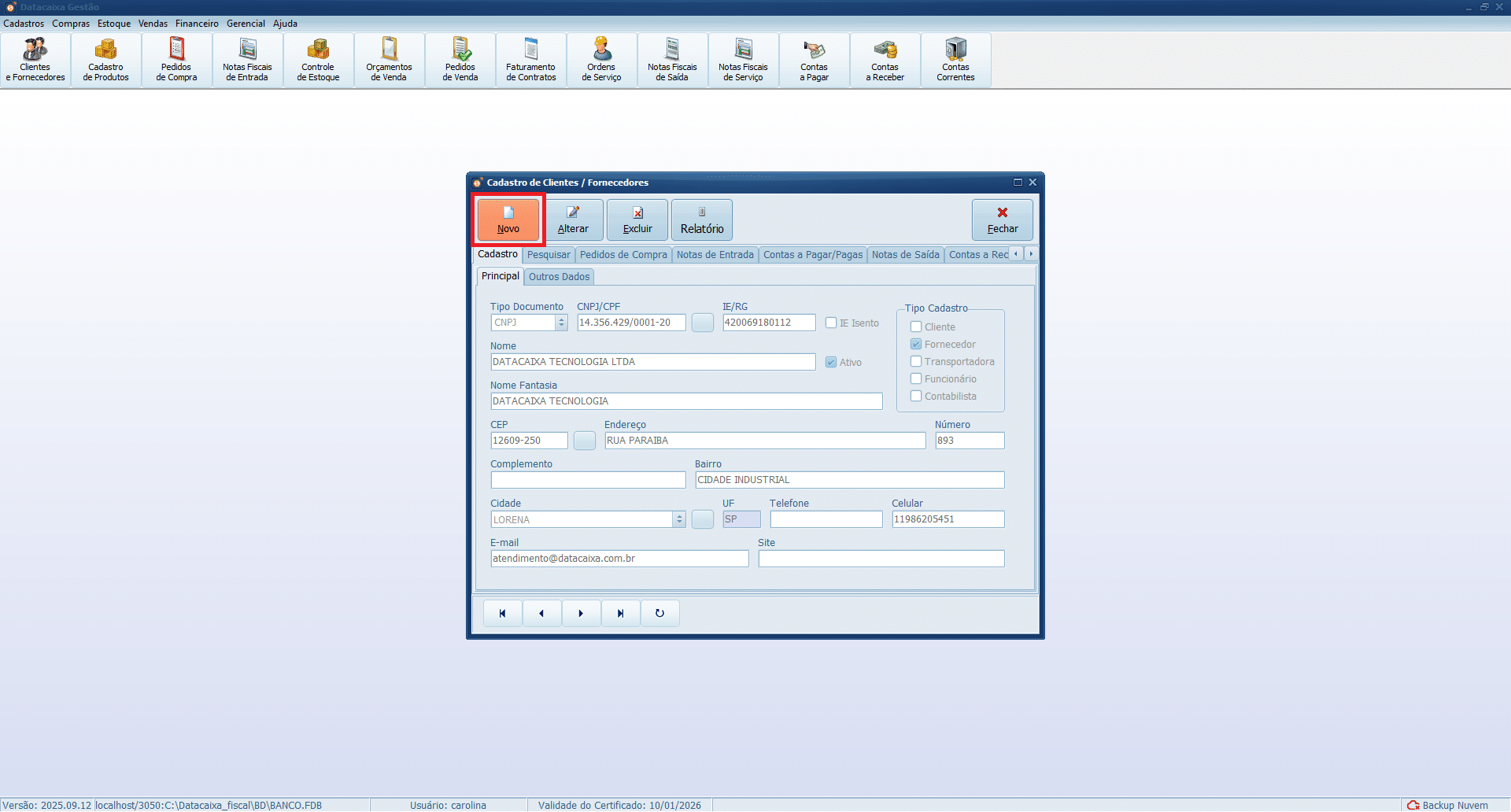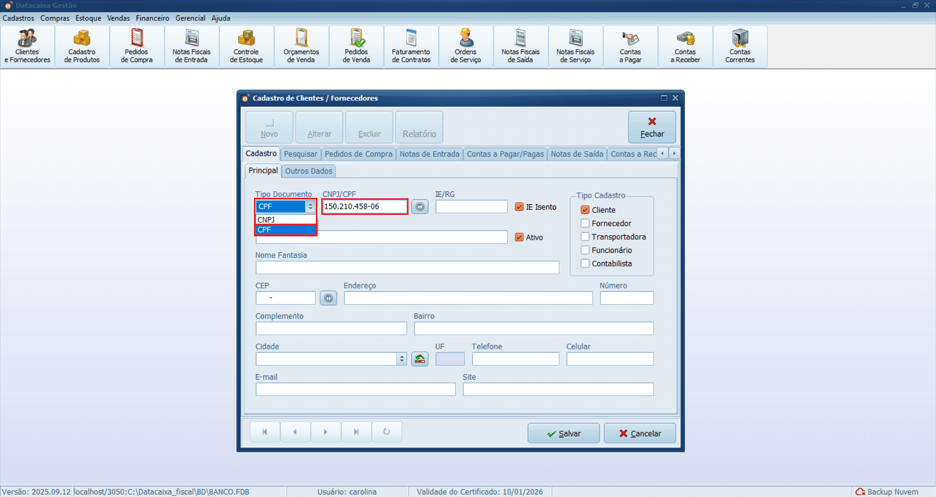 4- Clique no menu Cadastros > Clientes/Fornecedores.