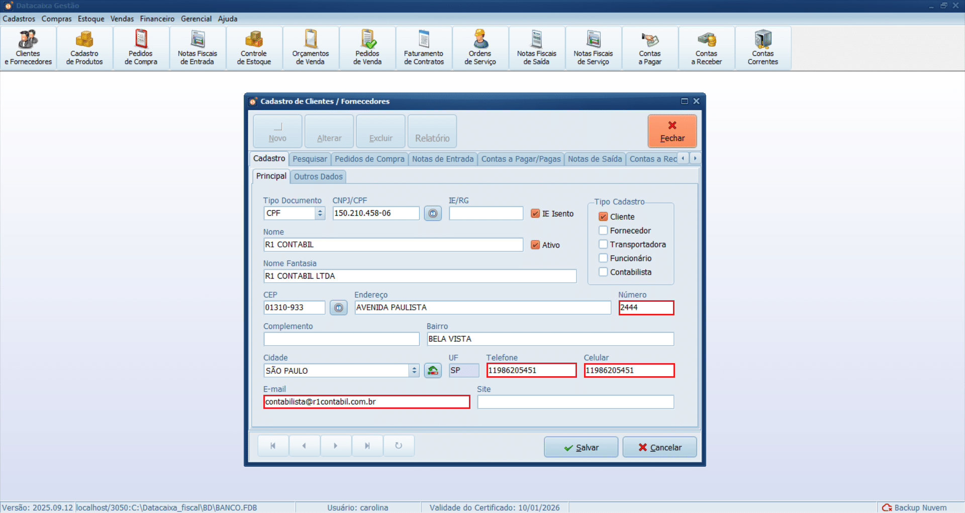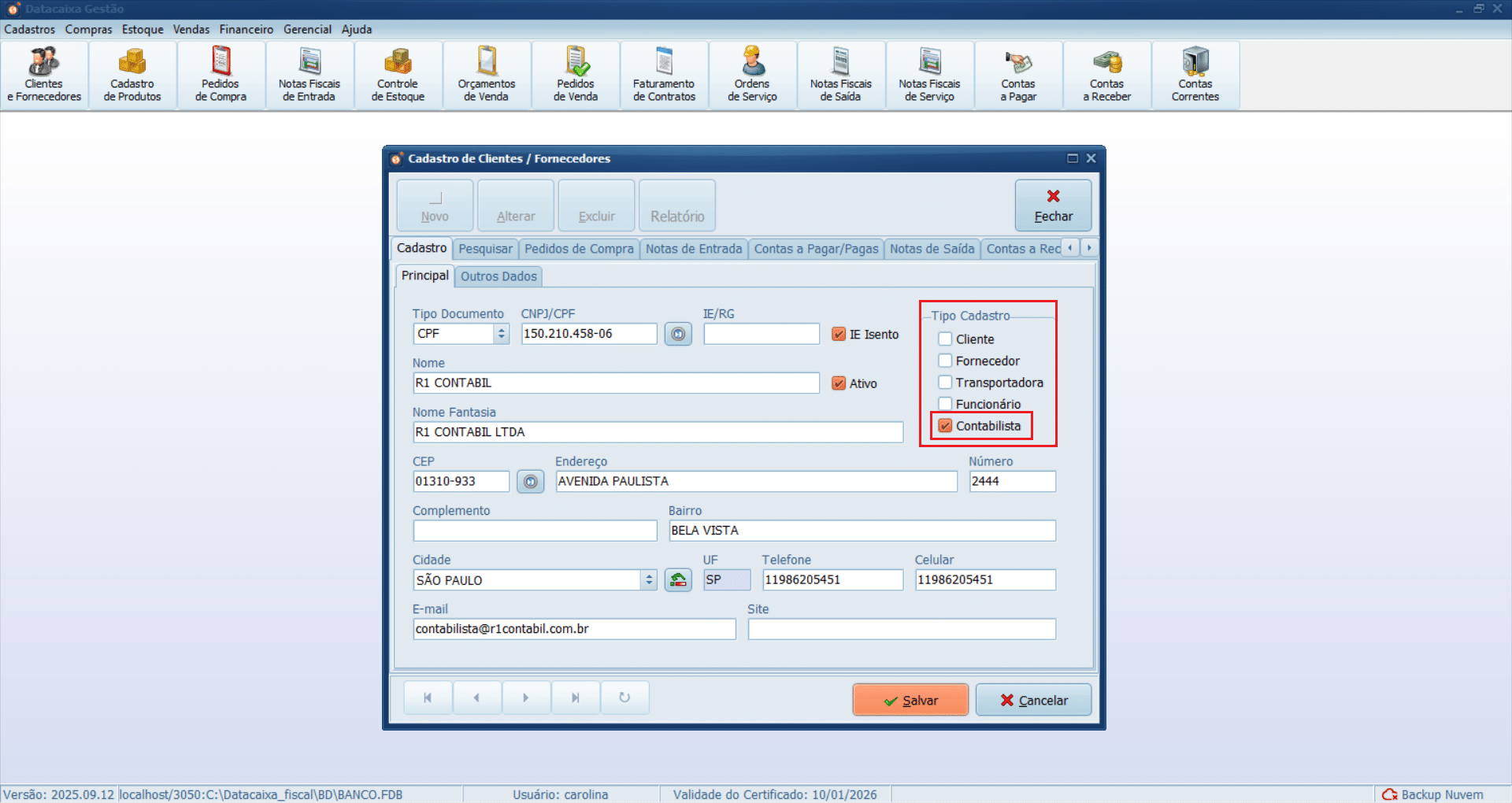 9- Preencha os campos Número do endereço, Telefone, Celular e E-mail do contabilista.