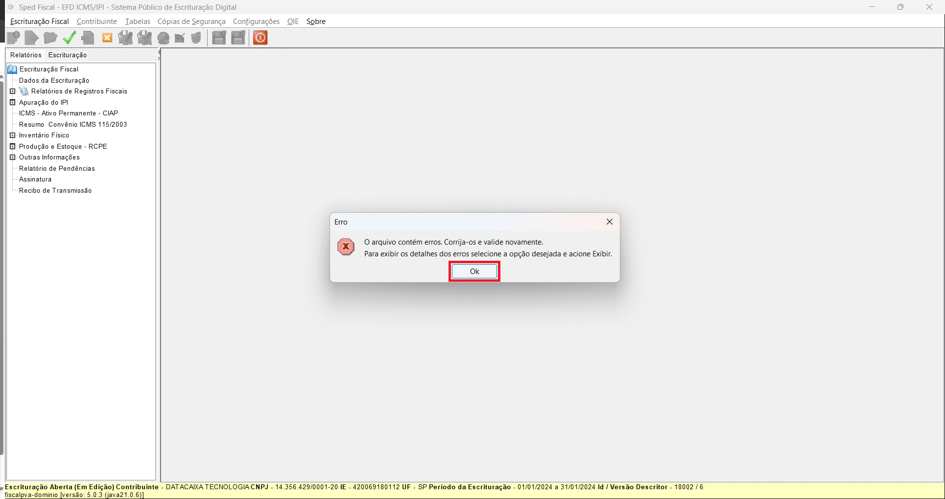 22- Clique em OK para corrigir as pendências encontradas.