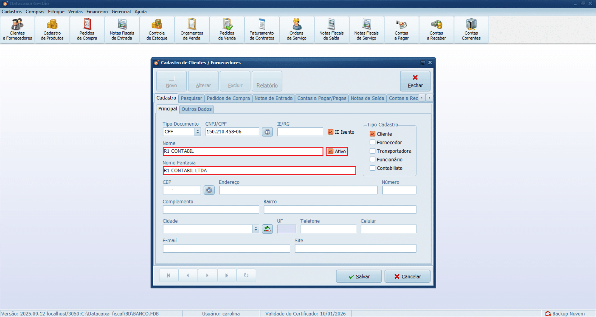 7- Preencha os campos com o Nome e Nome Fantasia do contabilista. Mantenha o cadastro com a opção Ativo selecionado.