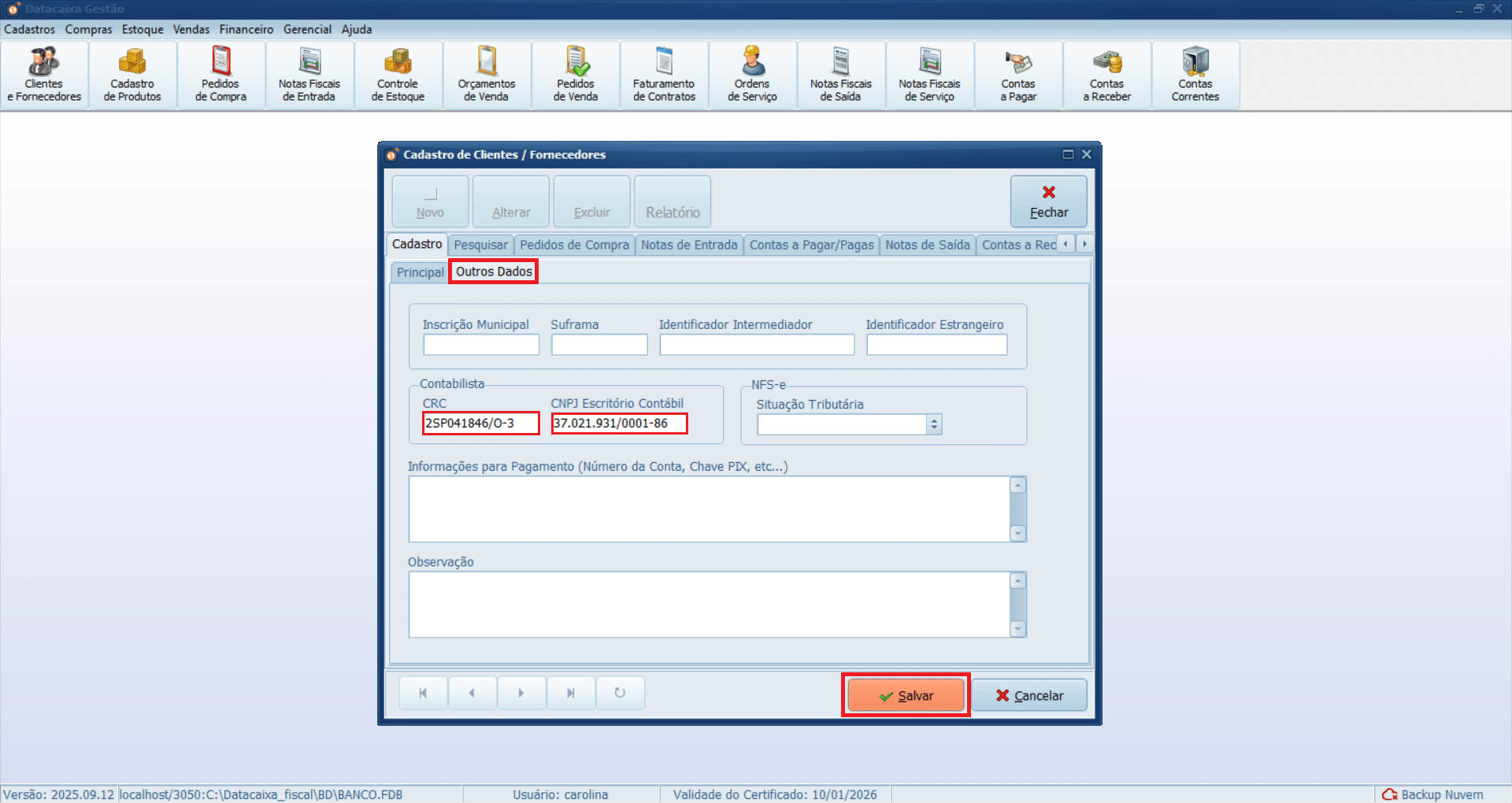 11- Clique na aba Outros Dados, depois informe o CRC e o CNPJ do Escritório Contábil. Em seguida, clique em Salvar.