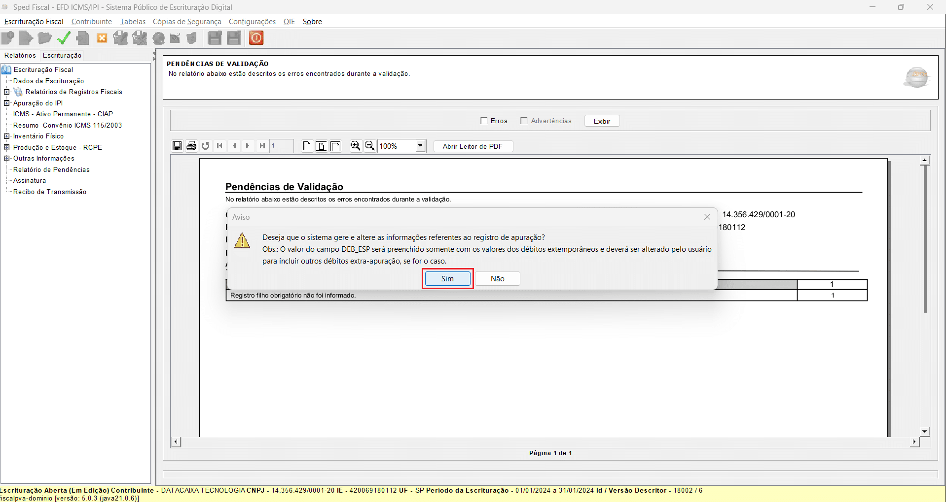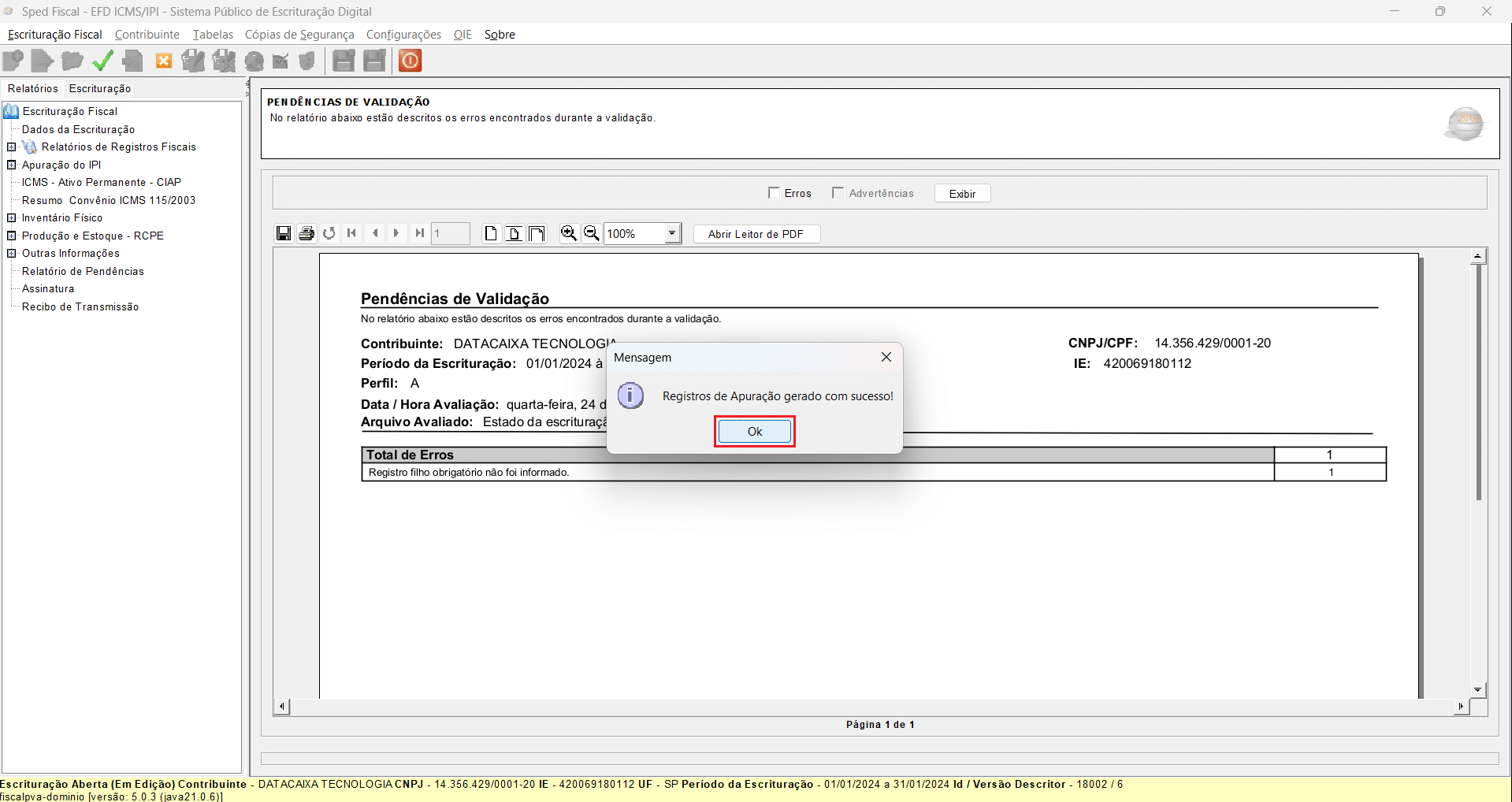 24- Registro de Apuração gerado com sucesso. Clique em OK para continuar.