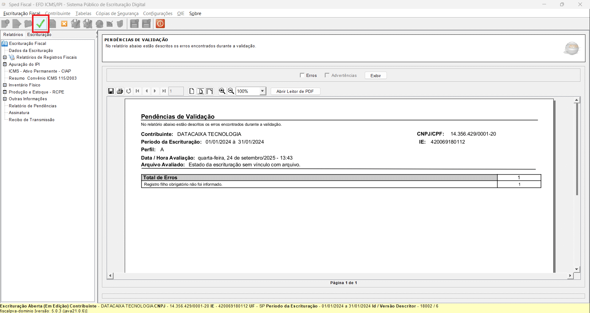 25- Clique no botão de check verde para Verificar Pendências de Escrituração Fiscal