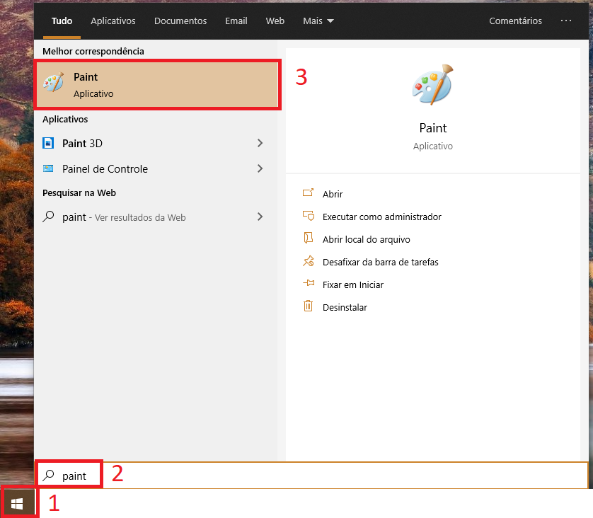 1- Clique no Menu Iniciar, pesquise o programa Paint e clique nele para abrir.