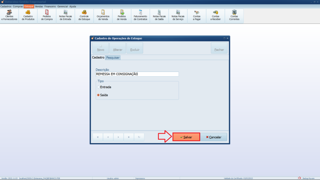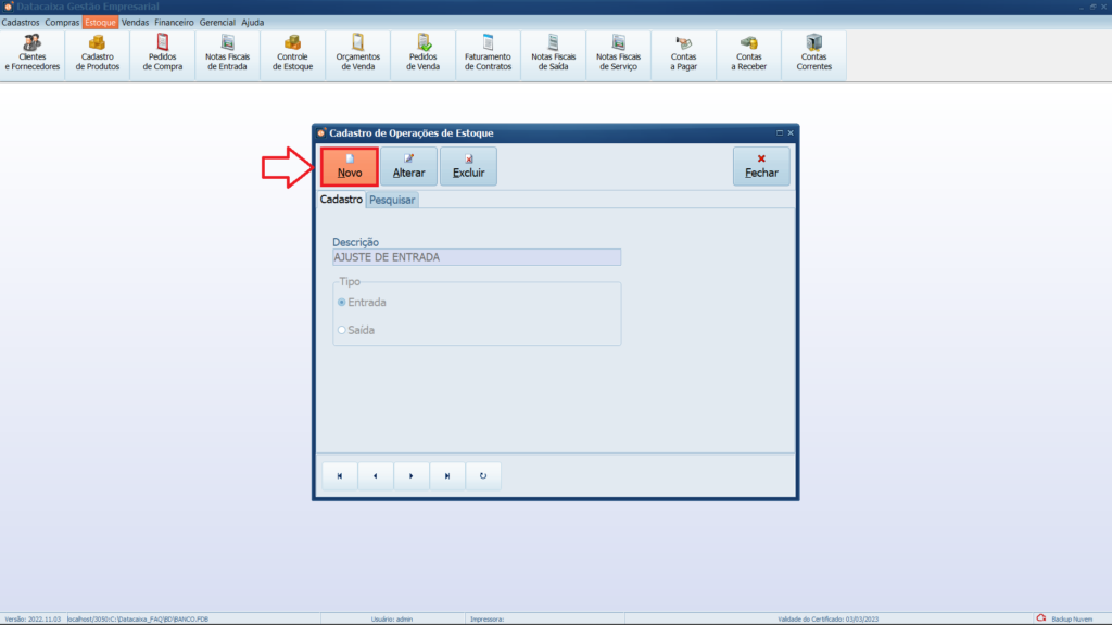 Pronto! Você cadastrou uma no nova operação de estoque no Sistema.