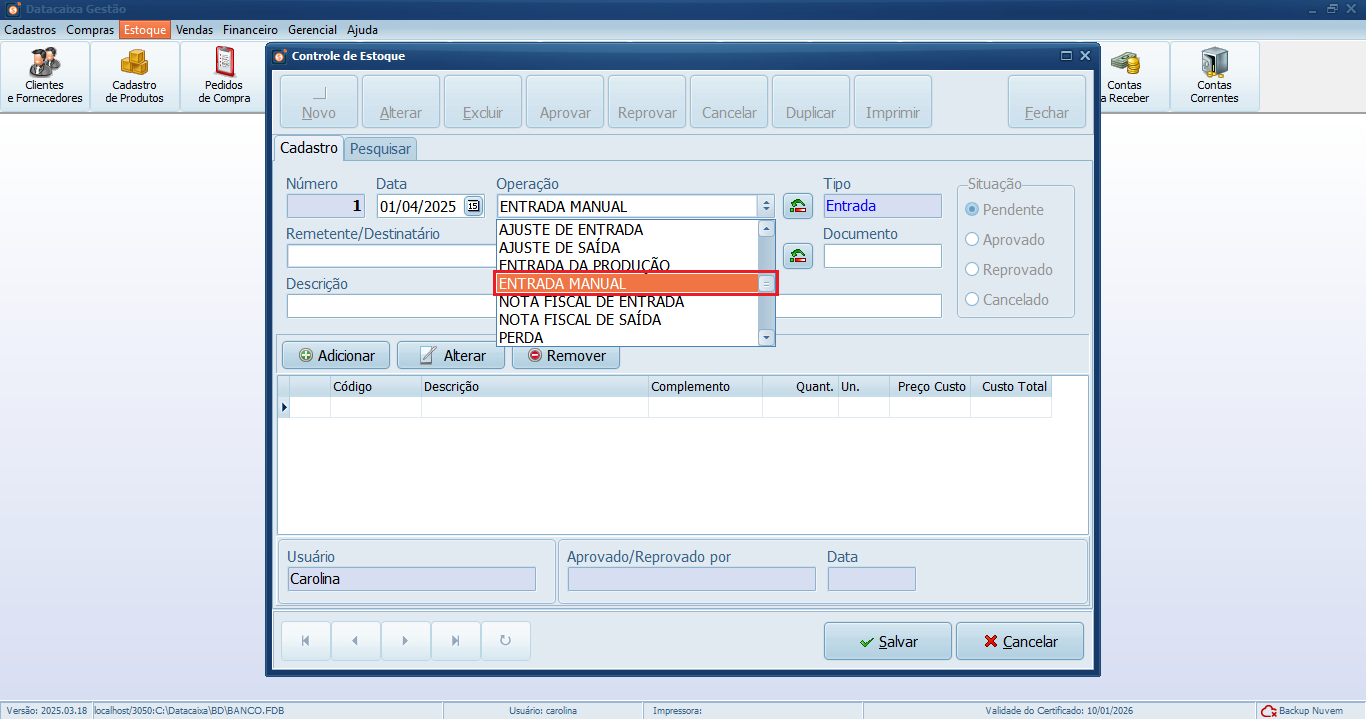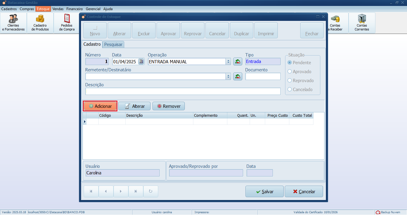 🚫 Cancelar: cancela o registro da entrada, sem impacto no controle de estoque.