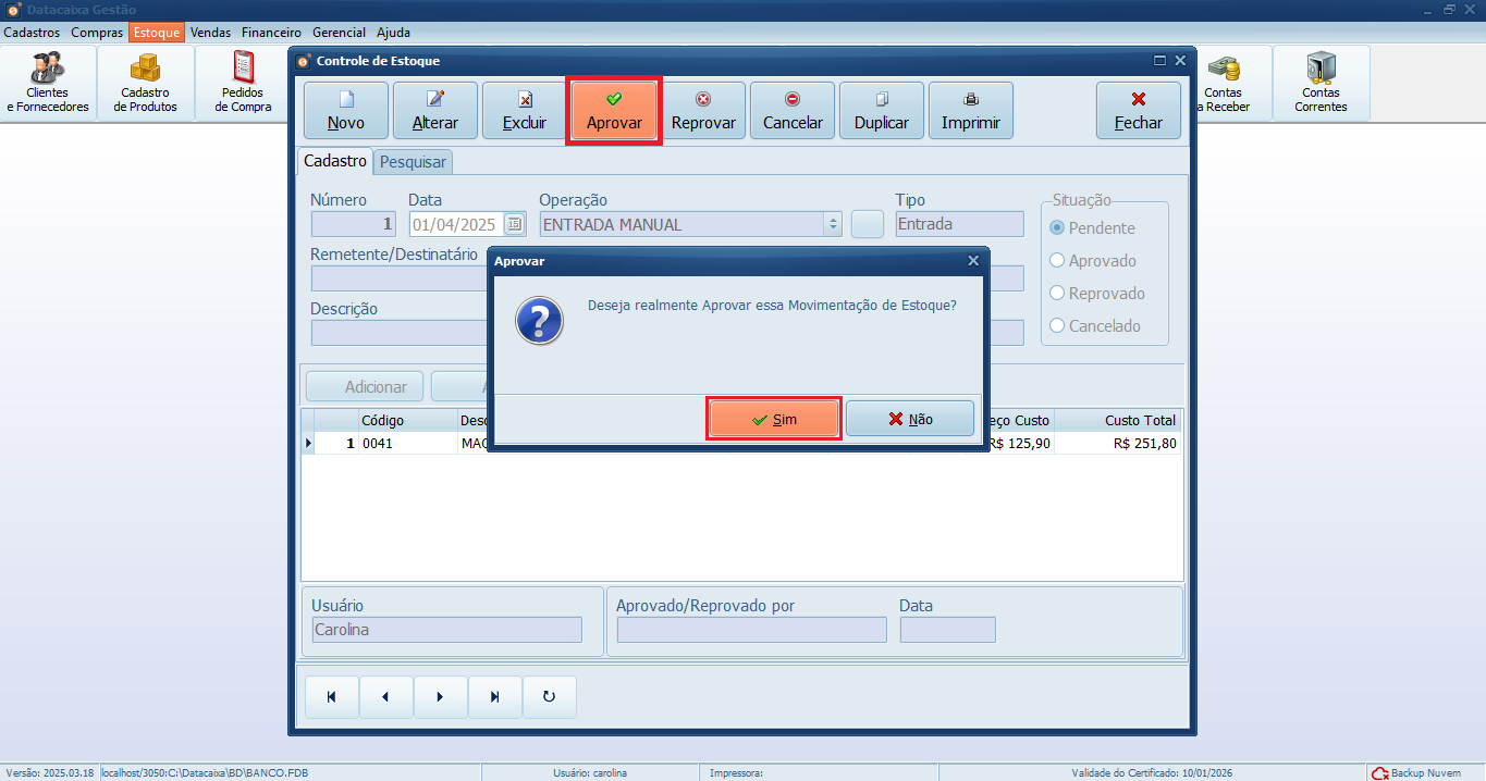 Aprovando a Movimentação de Estoque